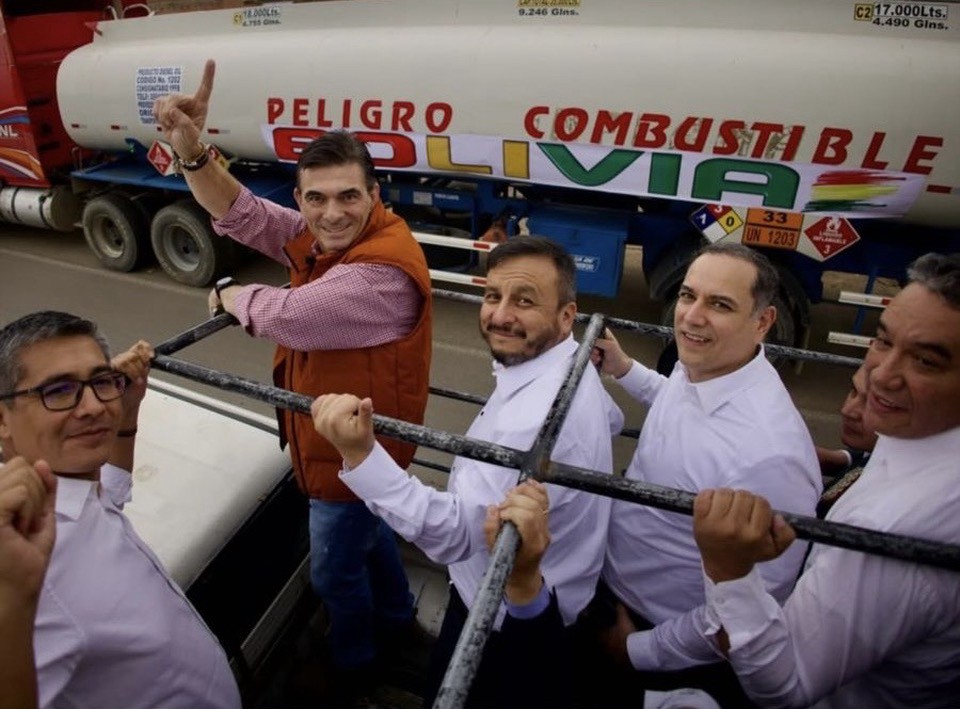 En la carrocería, en carretera, trabajando: el presidente Rodrigo Paz, sus ministros de Economía (Gabriel Espinoza) e Hidrocarburos (Mauricio Medinacelli) y el presidente de YPFB (Youssef Akly).