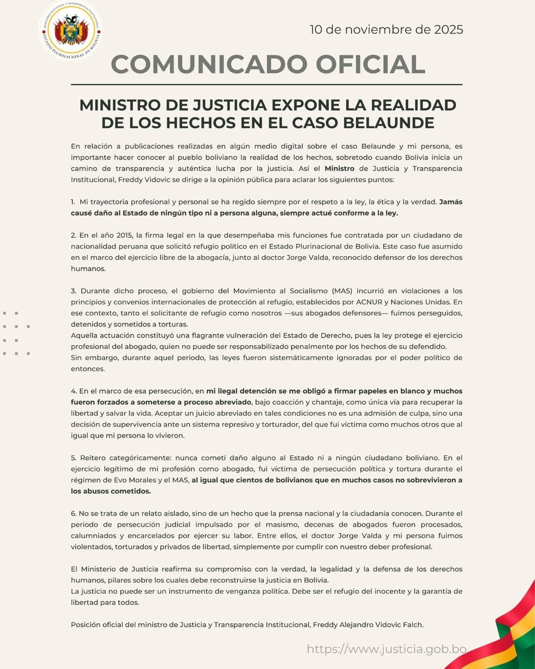 El ministro de Justicia, Freddy Vidovic, emitió un comunicado oficial en el que negó haber causado daño al Estado o a ciudadanos durante el caso Belaunde.