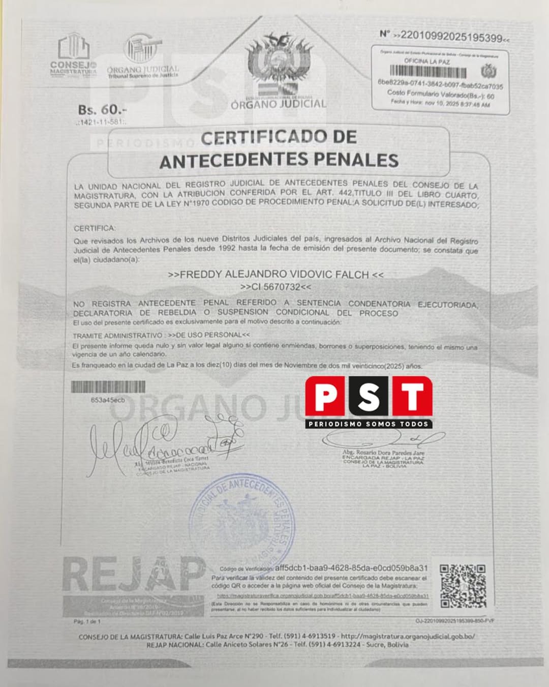 El nuevo Ministro de Justicia Freddy Alejandro Vidovic, posesionado ayer por el presidente Rodrigo Paz, no cuenta con ningún tipo de antecedente penal. Así lo demuestra el certificado emitido por el REJAP, que confirma que no registra procesos ni sanciones en su contra. Este documento fue presentado como parte de los requisitos para asumir la cartera del Ministerio de Justicia.
