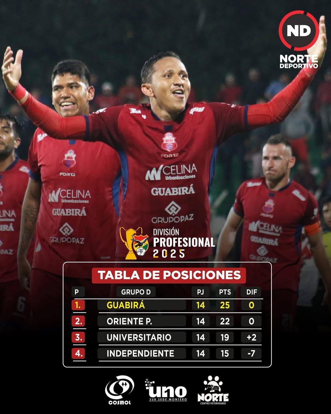 ¡Qué bien se ve la tabla con Guabirá puntero y clasificado! Primeros. 25 puntos. Tres más que el segundo.
