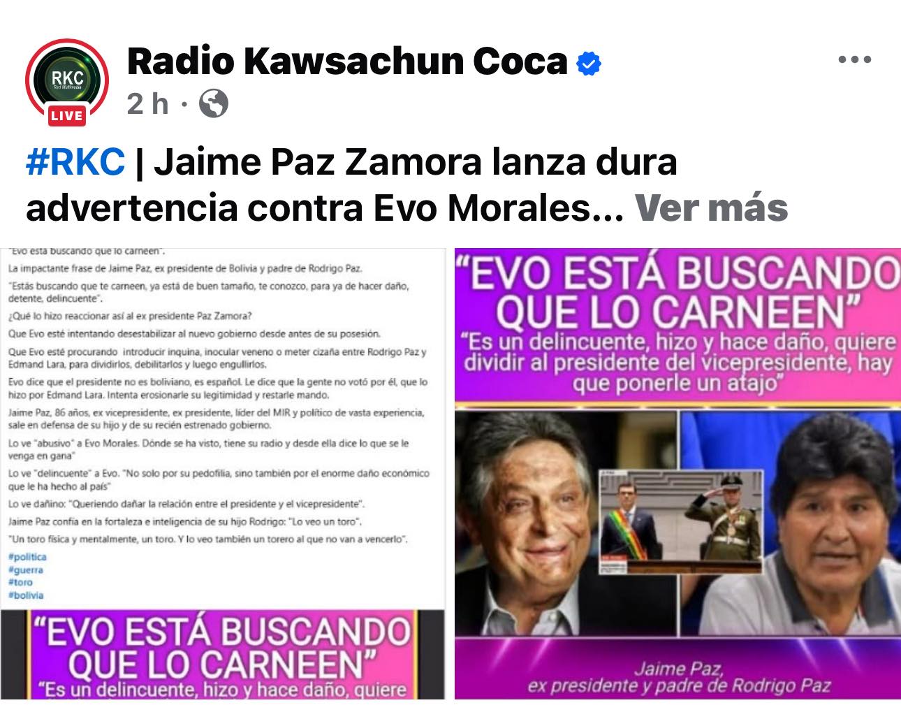 Evo ya está avisado y le asusta que “lo carneen”. Reacciona la radio de Evo y califica de “dura advertencia” del ex presidente Jaime Paz Zamora, padre del actual presidente Rodrigo Paz.