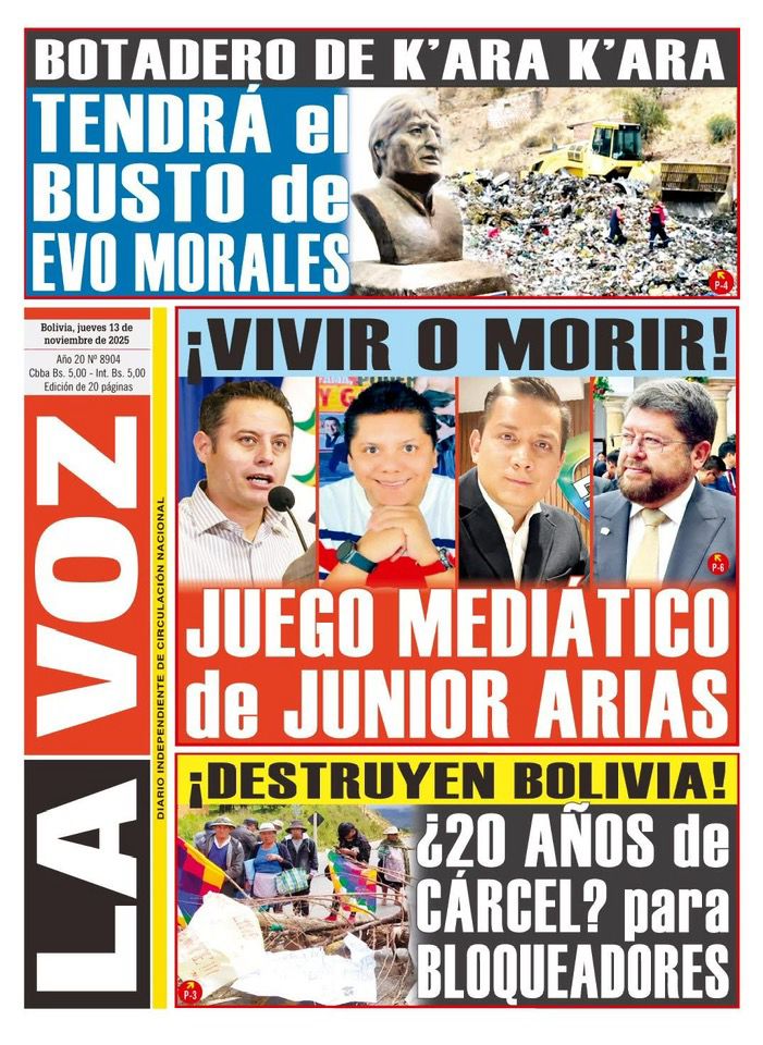 “!Vivir o morir! El juego mediático de Junior Arias”. Esta es la portada de hoy del diario La Voz, de Cochabamba.