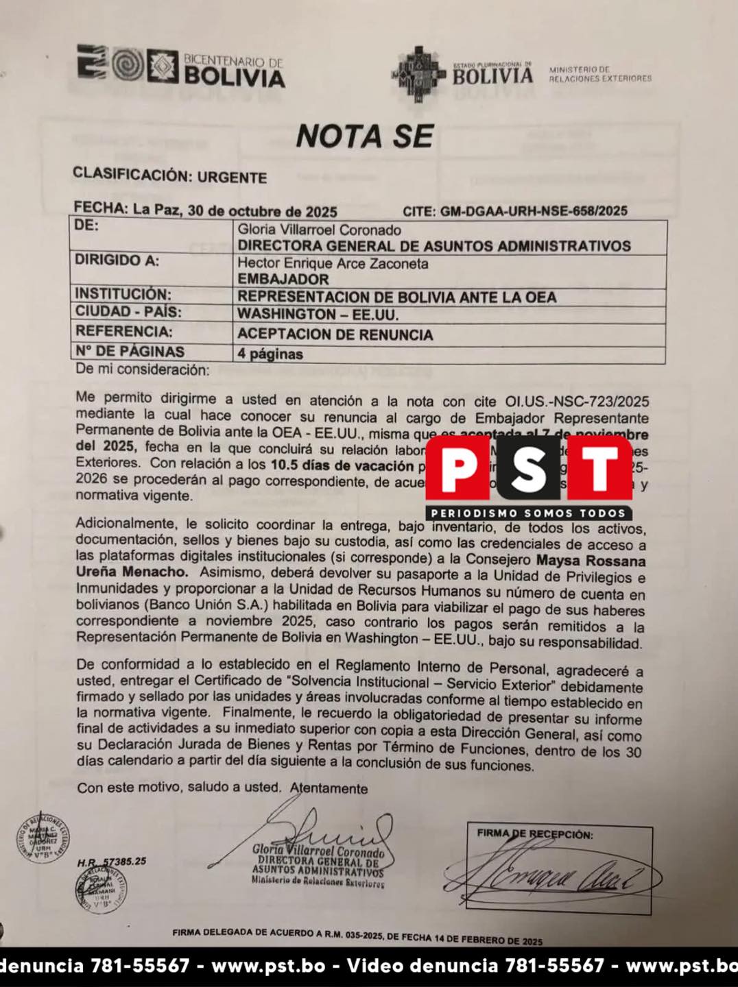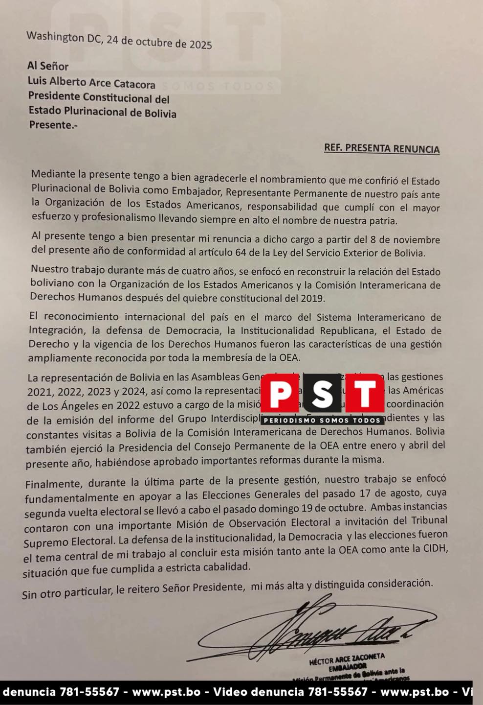 Héctor Arce presentó su renuncia al cargo de embajador de Bolivia ante la OEA, decisión que hizo pública a través de sus redes sociales. Indicó que la renuncia fue entregada el 24 de octubre y aceptada el 30 por la Cancillería. Agradeció la oportunidad de representar al país y destacó su etapa de trabajo en defensa de los pueblos de América desde la organización internacional.