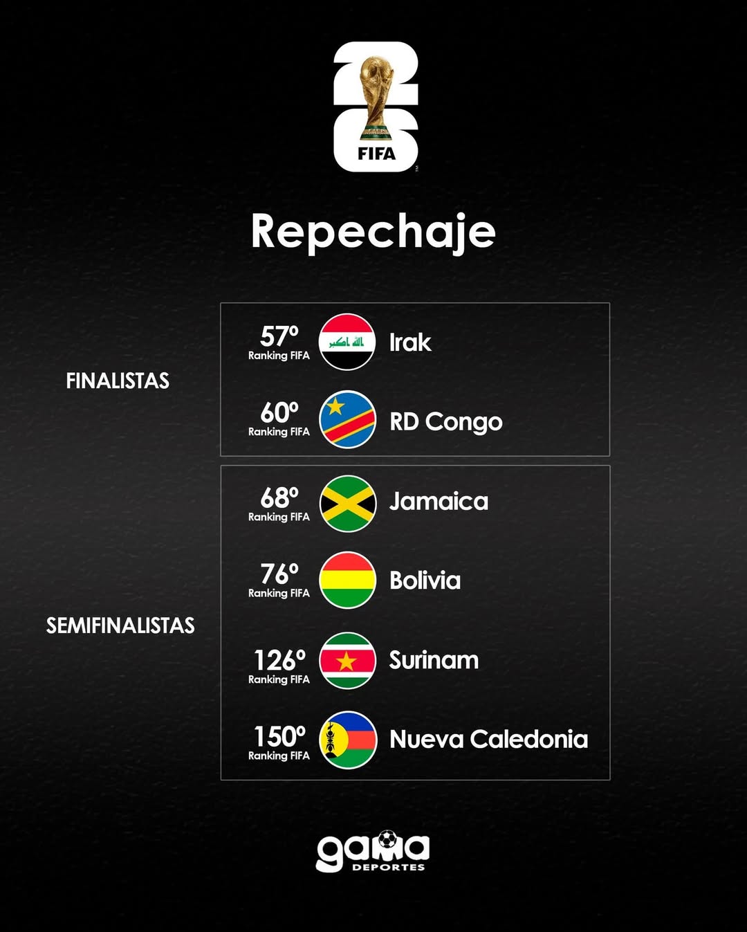 Bolivia ya conoce su posible rival para la fase inicial del repechaje mundialista: Jamaica 🇯🇲 o Surinam 🇸🇷. Una de estas dos selecciones de la Concacaf enfrentará a La Verde en la llave eliminatoria. Nueva Caledonia queda descartada por reglamento FIFA, que impide duelos entre equipos de la misma confederación en primera fase. El Ranking FIFA confirma además que República Democrática del Congo 🇨🇩 e Irak 🇮🇶 avanzan directo a la instancia definitoria.