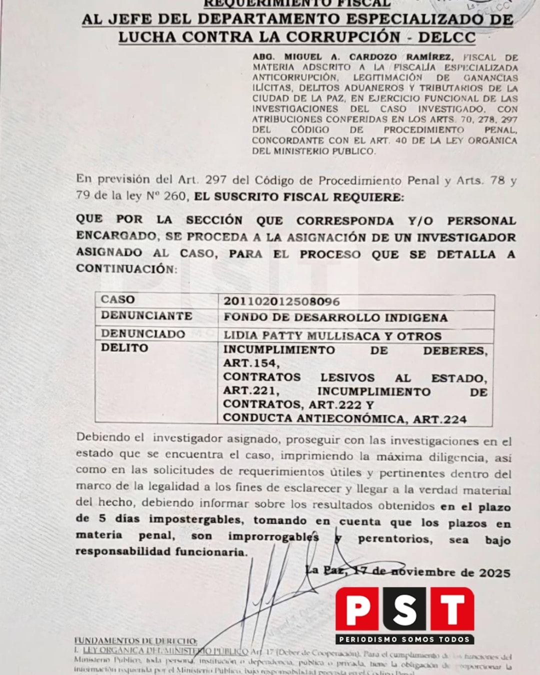 La Fiscalía reactivó las investigaciones por las presuntas irregularidades en el Fondo Indígena y ordenó a la DELCC asignar de inmediato un investigador para profundizar las acusaciones contra Lidia Patty por posibles delitos de corrupción, contratos lesivos al Estado e incumplimiento de deberes, instruyendo además que se presenten resultados en un plazo máximo de cinco días, una decisión que vuelve a encender la polémica y abre interrogantes sobre si esta vez habrá justicia o si el caso volverá a quedar envuelto en sospechas de impunidad.