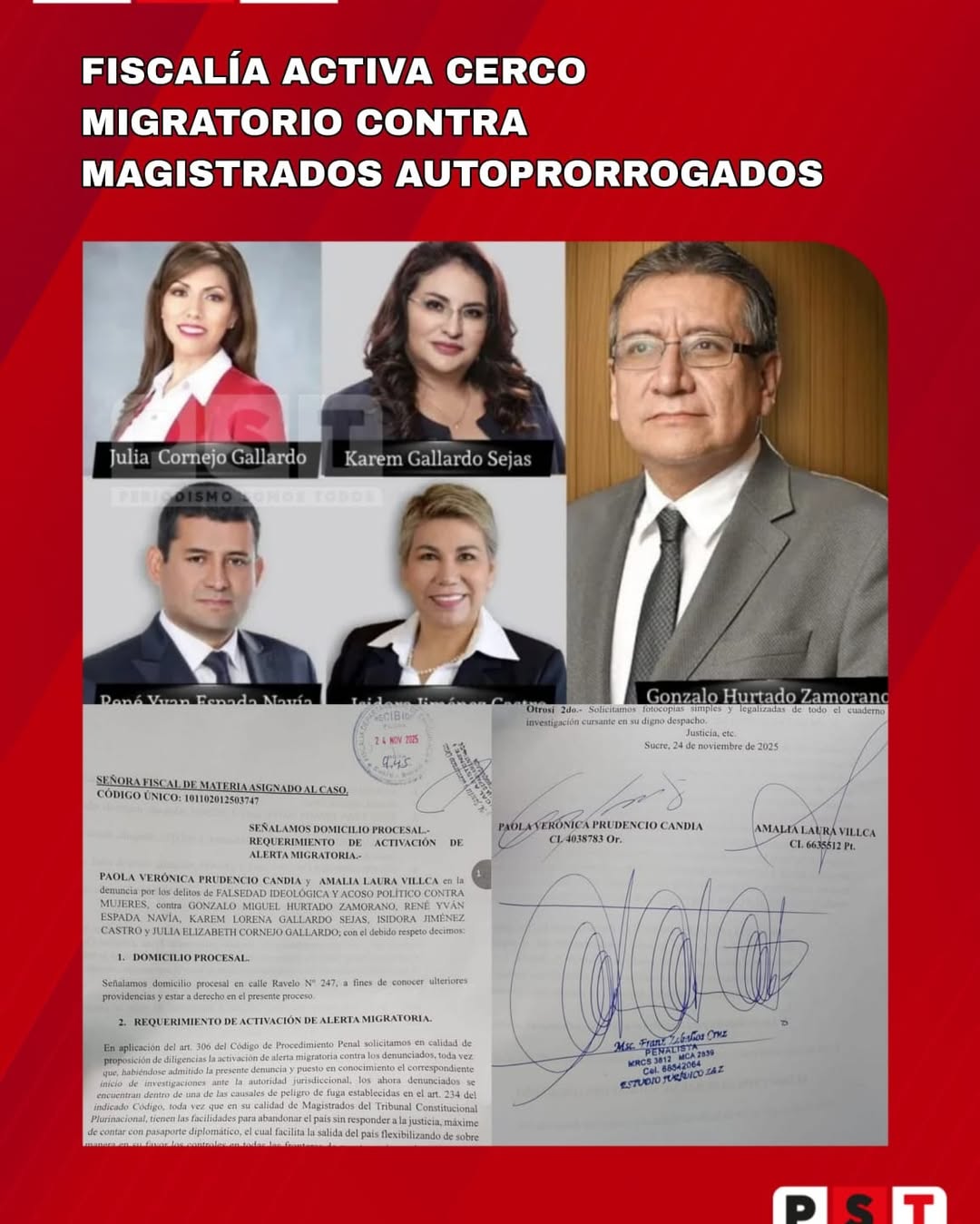 Las magistradas electas Paola Verónica Prudencio Candia y Amalia Laura Villca denunciaron a Gonzalo Miguel Hurtado Zamorano, René Yván Espada Navía, Karem Lorena Gallardo Sejas, Isidora Jiménez Castro y Julia Elizabeth Cornejo Gallardo. Aseguran que existe peligro de fuga, respaldado en el artículo 234 del Código de Procedimiento Penal, debido a que los denunciados cuentan con pasaportes diplomáticos y recursos que facilitarían su salida del país.