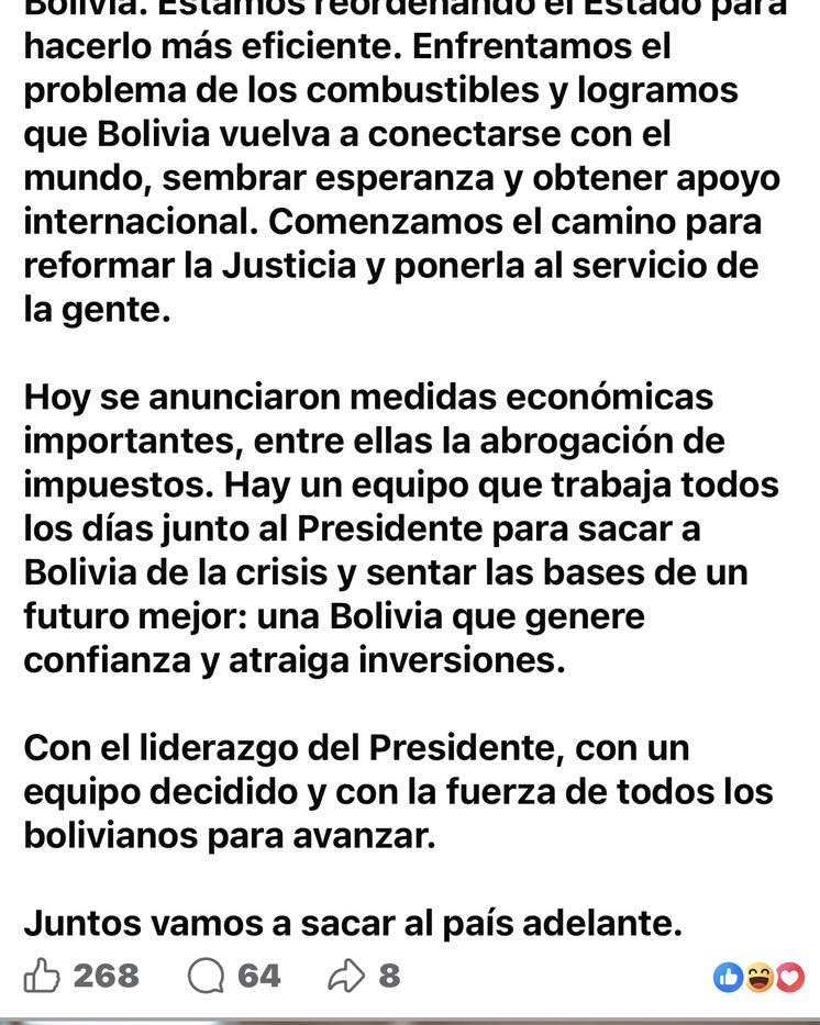 Hoy se anunciaron medidas económicas importantes, entre ellas la abrogación de impuestos. Hay un equipo que trabaja todos los días junto al Presidente para sacar a Bolivia de la crisis y sentar las bases de un futuro mejor: una Bolivia que genere confianza y atraiga inversiones.