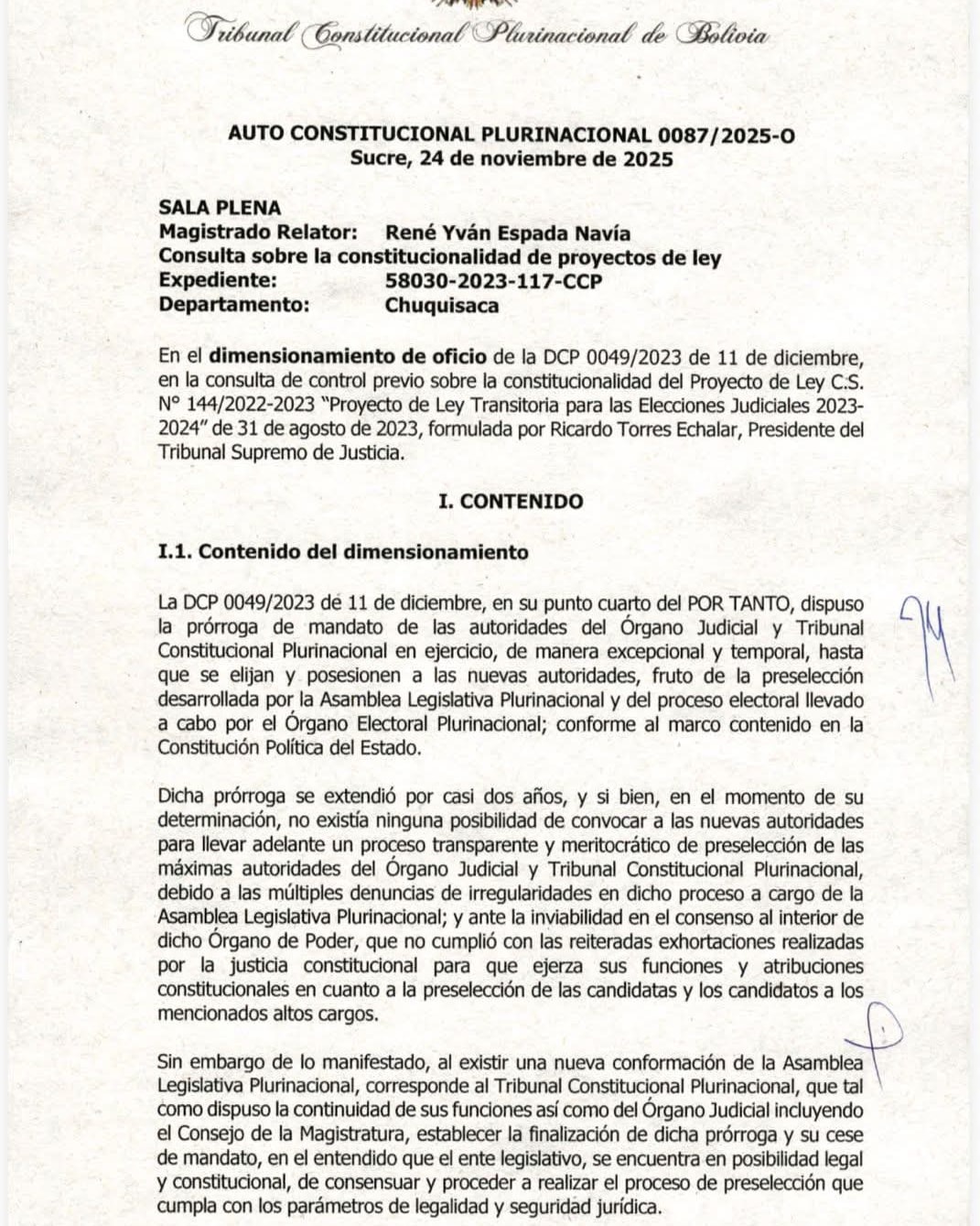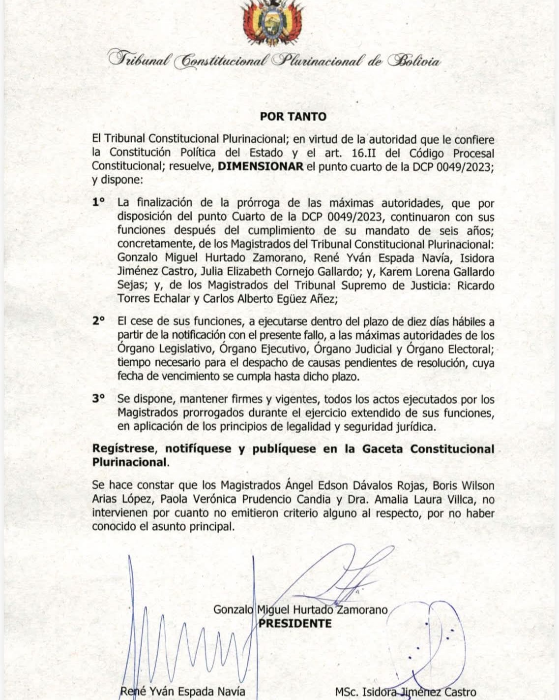 El Tribunal Constitucional Plurinacional (TCP) emitió una resolución determinante: los magistrados del propio TCP y del Tribunal Supremo de Justicia (TSJ) que permanecían en funciones bajo prórroga deberán cesar en sus cargos en un plazo de diez días hábiles.