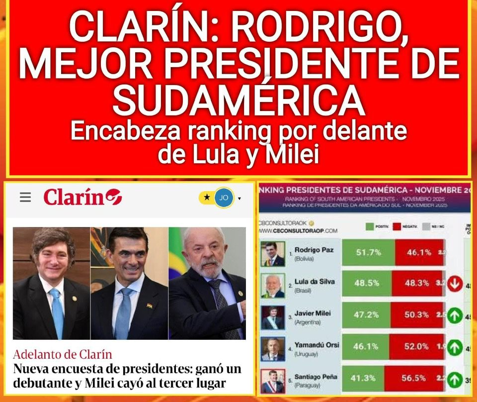 Ranking: Rodrigo Paz, mejor presidente de Sudamérica. Por delante de Lula y a Milei. El presidente de Bolivia sorprende.