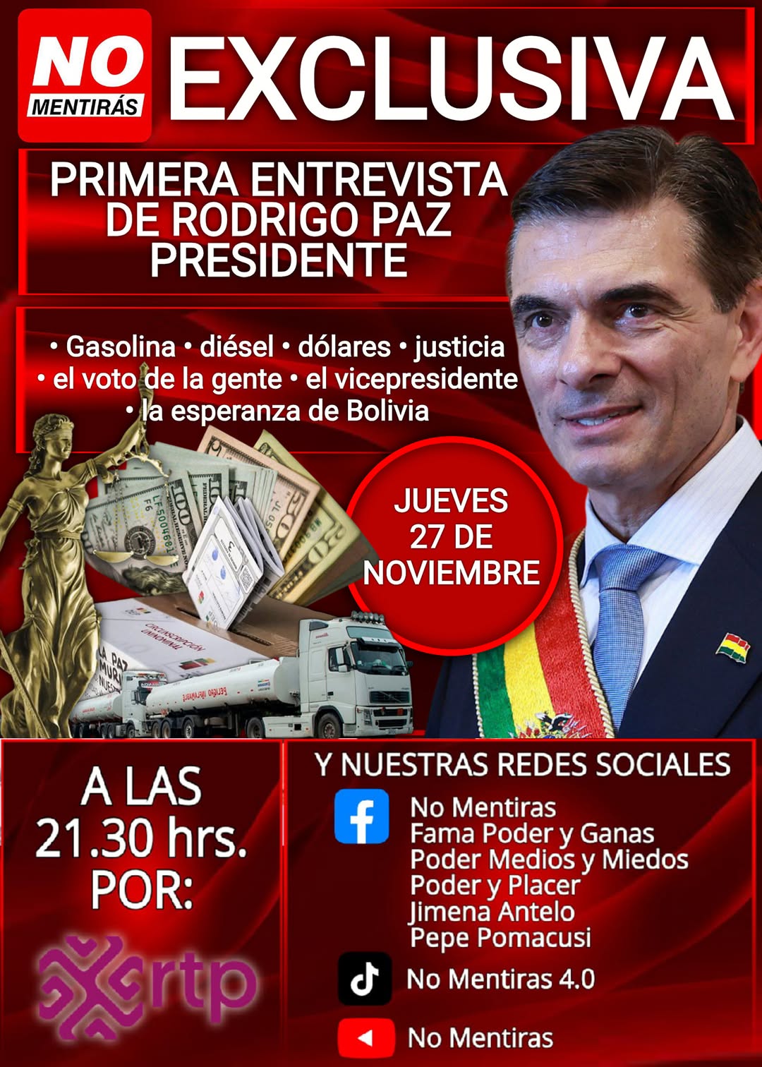 Mañana, primera entrevista de Rodrigo Paz Presidente. A las 21.30. En No Mentirás.Categorías NoticiasEtiquetas , Facebook, Pepe Pomacusi Periodista 27/11/2025 Fuente: Pepe Pomacusi Periodista
