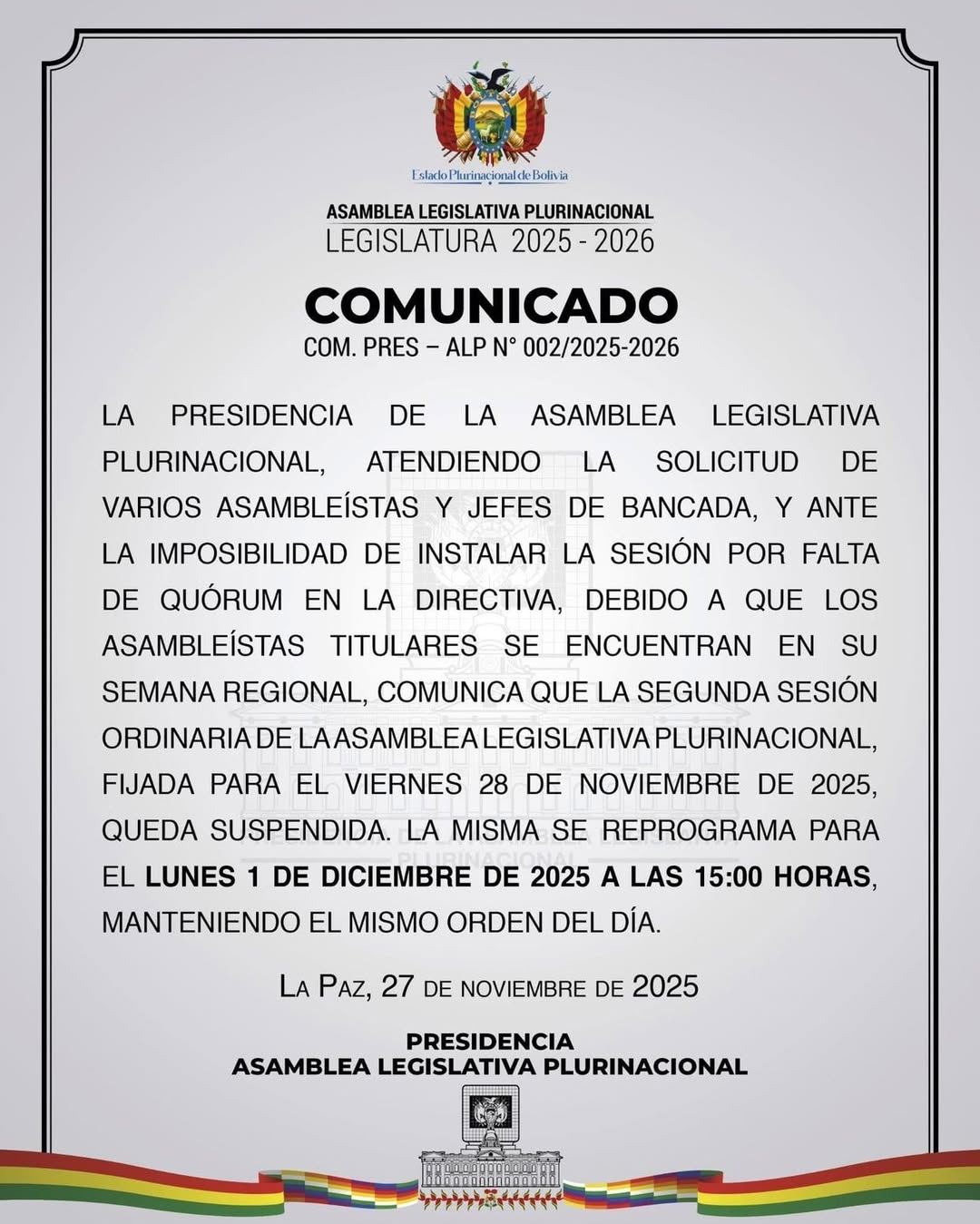 La sesión convocada por el vicepresidente Edmand Lara, prevista para este viernes 28 de noviembre, no pudo instalarse por falta de quórum. Ante la ausencia de varios legisladores, la reunión fue suspendida y reprogramada para el lunes 1 de diciembre.