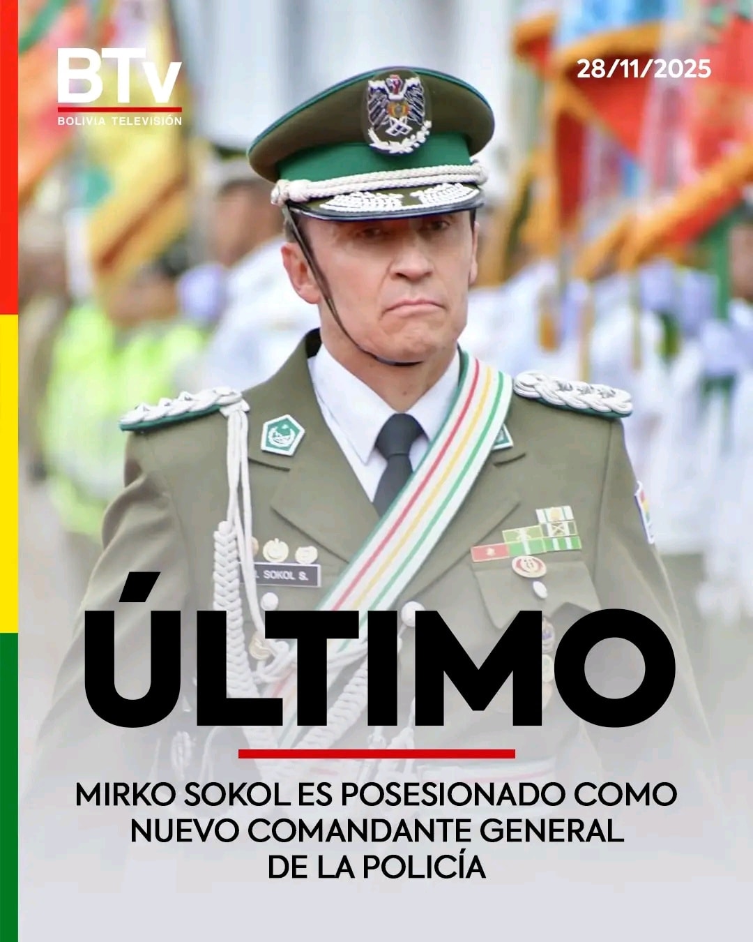 Mirko Sokol es posesionafo como el nuevo Comandante General de la Policía Boliviana.Categorías NoticiasEtiquetas , Facebook, Pepe Pomacusi Periodista 28/11/2025 Fuente: Pepe Pomacusi Periodista