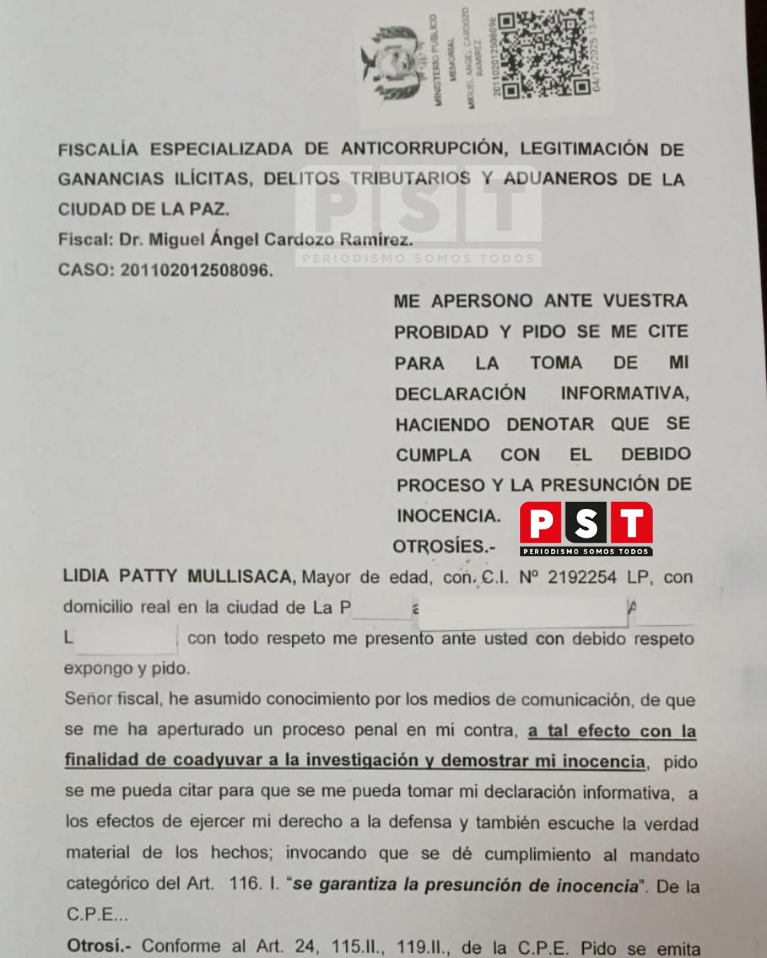 La exautoridad Lidia Patty, relacionada con el caso del Fondo Indígena, presentó ante la Fiscalía de Anticorrupción de La Paz un pedido formal para rendir su declaración informativa, tras enterarse por medios de comunicación del inicio de un proceso en su contra. En su solicitud, dirigida al fiscal Miguel Ángel Cardozo Ramírez, Patty aseguró que está dispuesta a colaborar con la investigación y reafirmó su derecho a la presunción de inocencia y al debido proceso, solicitando además que se emita el requerimiento fiscal correspondiente para que se lleve a cabo su declaración dentro del caso que investiga presuntas irregularidades en la gestión de recursos del Fondo Indígena.