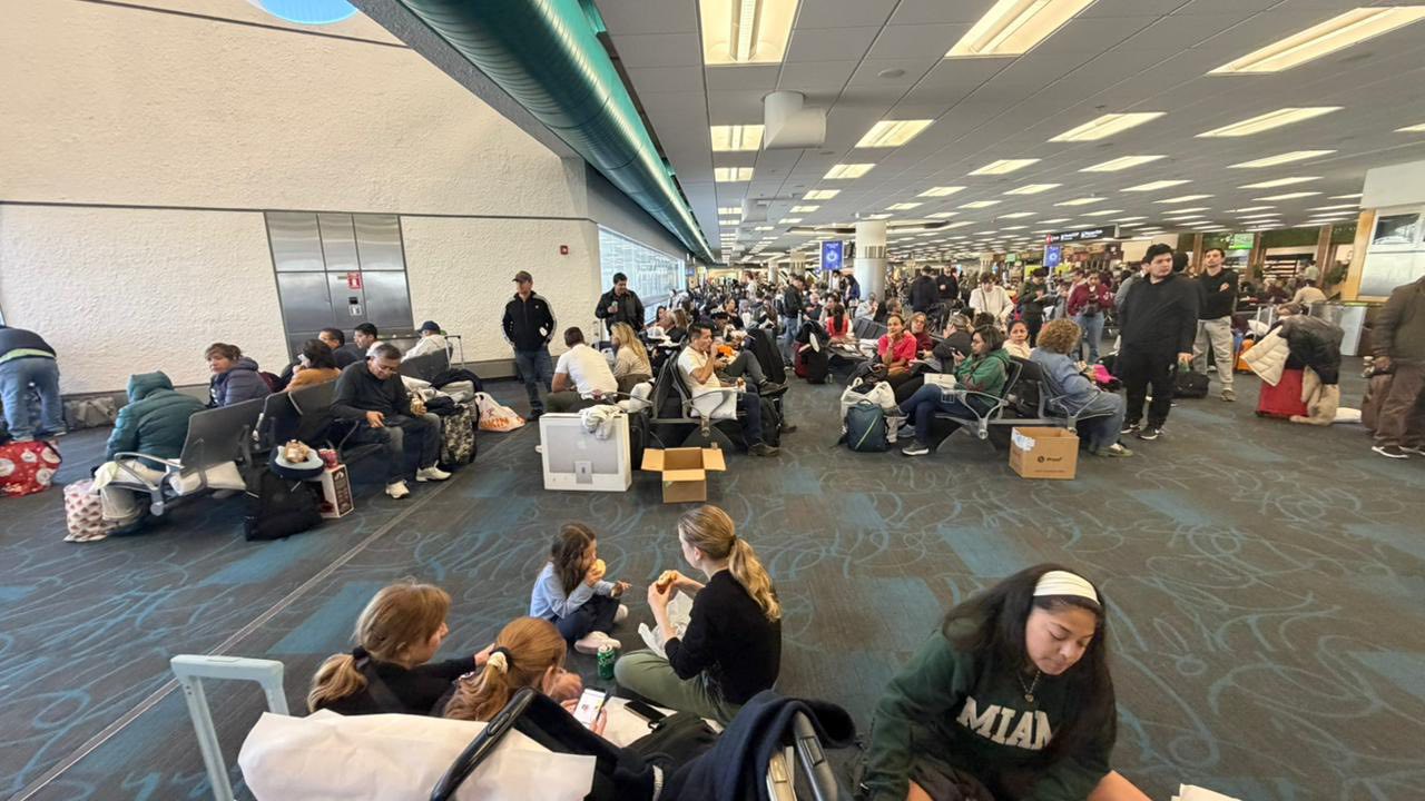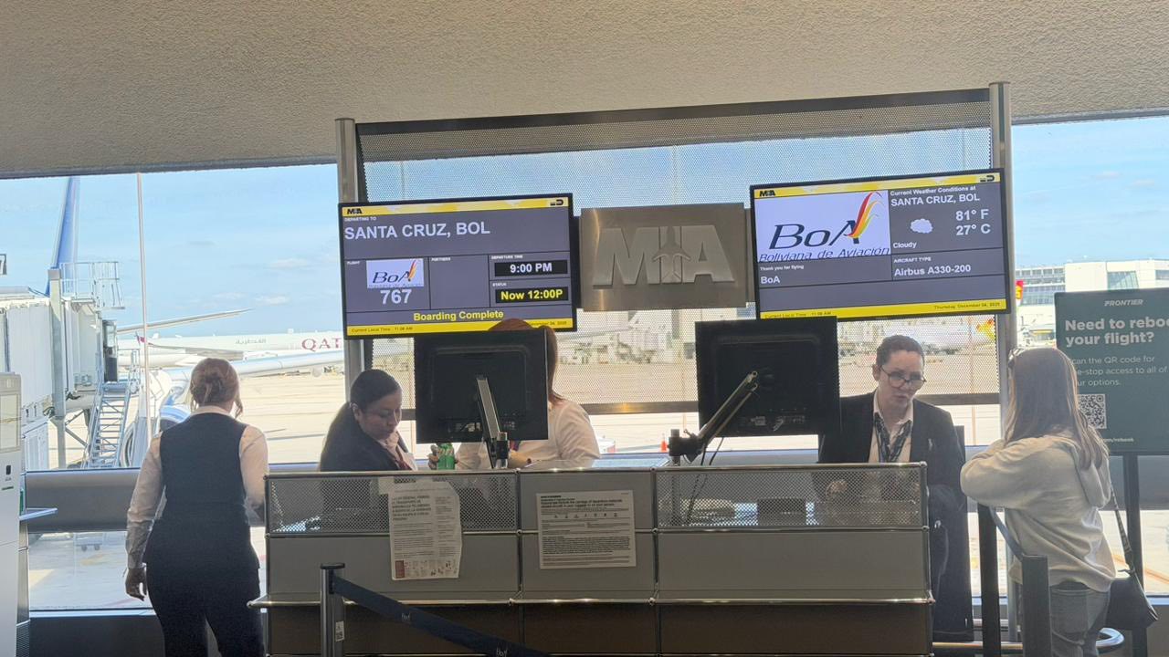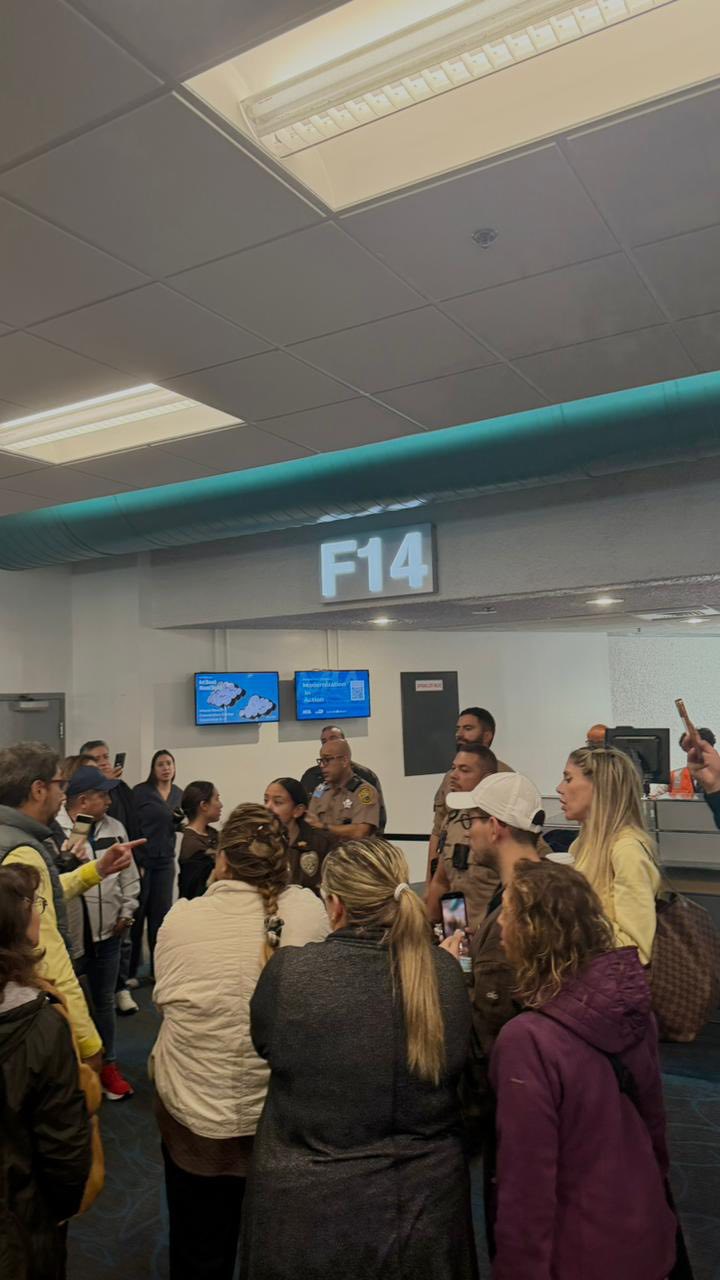 Vuelo Boa Miami-Scz, 15 horas de demora. Tuvieron que dormir en el suelo. Me envían estas fotos. Los pasajeros están molestos. Cansados.