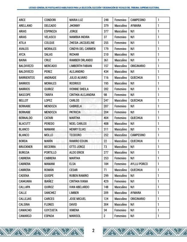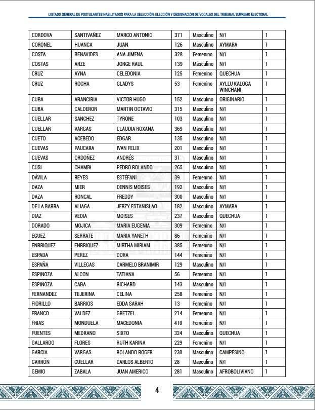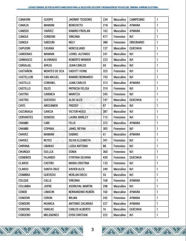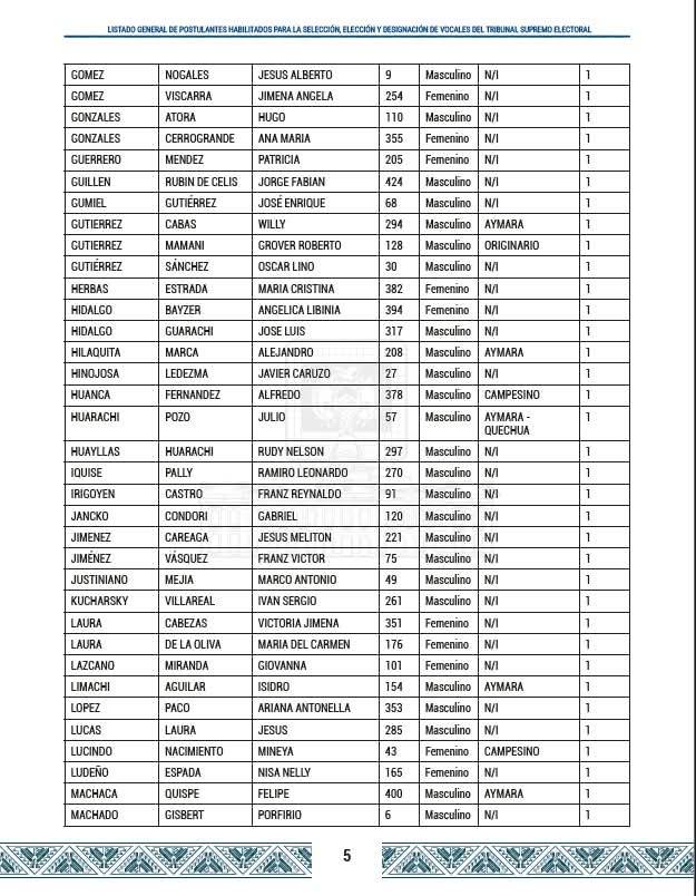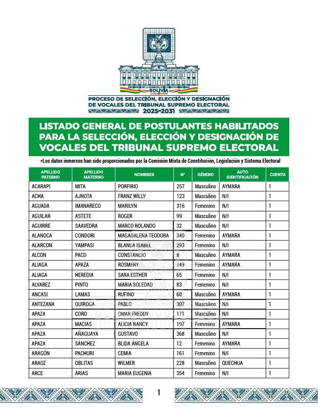 La Comisión Mixta de Constitución, Legislación y Sistema Electoral dio a conocer la lista definitiva de aspirantes habilitados para participar en el proceso de selección, elección y designación de los nuevos vocales del Tribunal Supremo Electoral (TSE), luego de finalizar la revisión de los requisitos generales y específicos de cada postulante, marcando un paso clave en la conformación del organismo electoral.