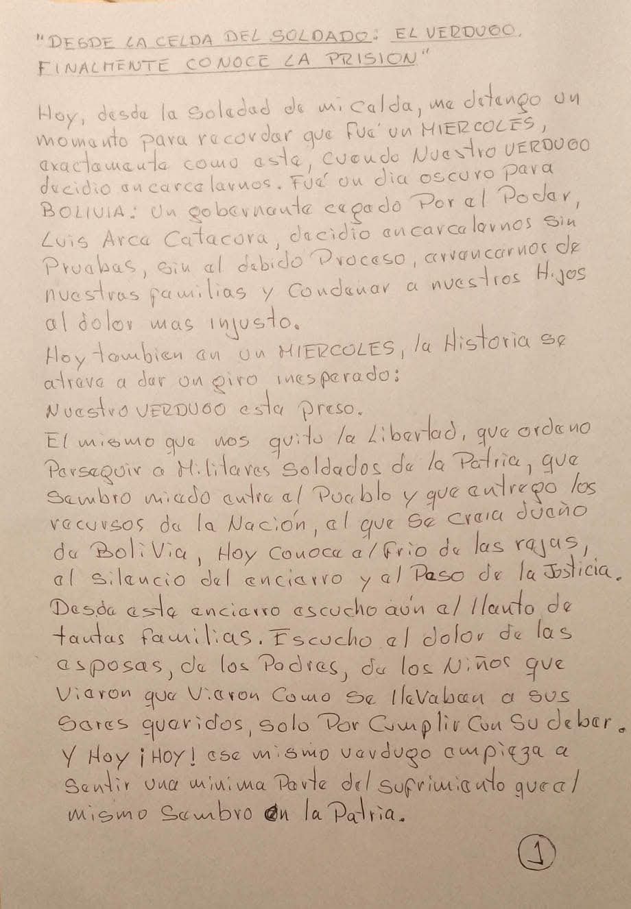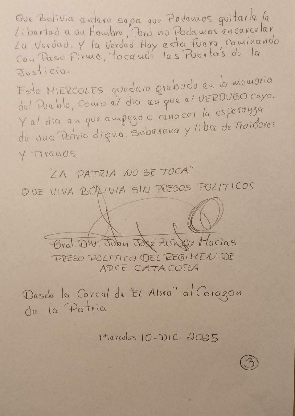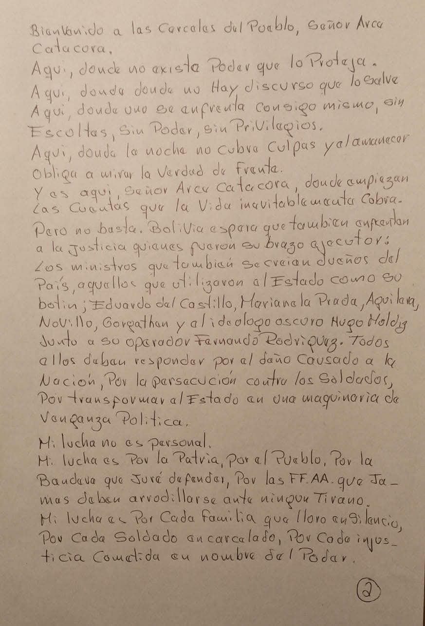El excomandante del Ejército, Juan José Zúñiga, actualmente recluido en el penal de El Abra, difundió una carta dirigida al expresidente Luis Arce —detenido por su presunta implicación en el millonario desfalco al Fondo Indígena— en la que, con tono irónico y desafiante, le expresa: “Bienvenido a las cárceles del pueblo, señor Luis Arce Catacora”, remarcando la caída política del exmandatario y alimentando la tensión en el escenario político nacional.