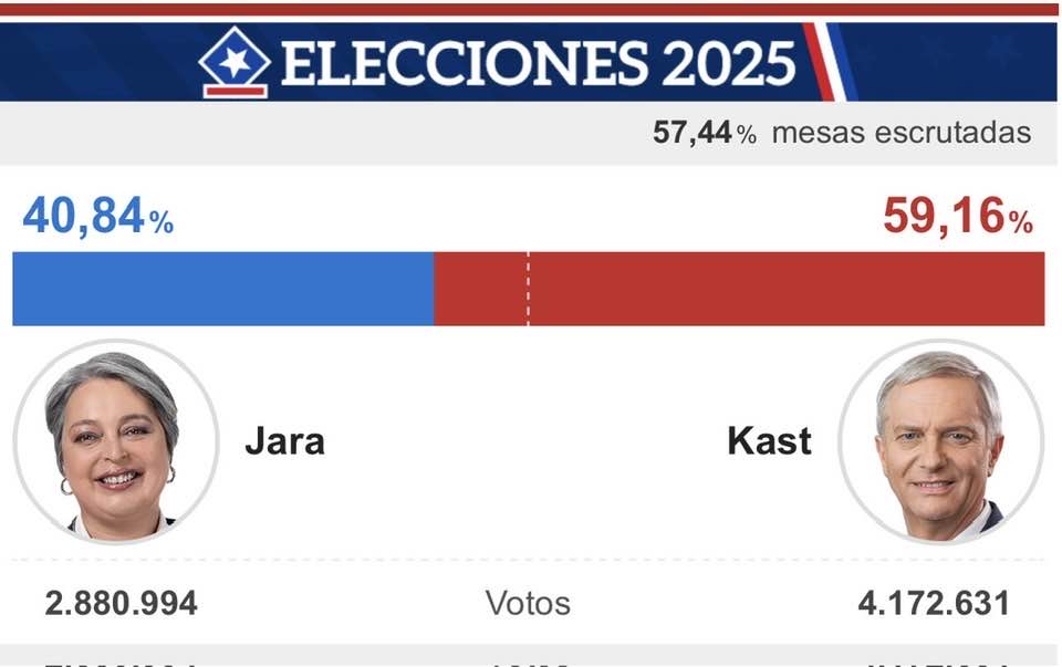 Ganó la derecha en Chile. José Antonio Kast, nuevo presidente.Categorías NoticiasEtiquetas , Facebook, Pepe Pomacusi Periodista 14/12/2025 Amplia victoria en segunda vuelta: 59% a 40%. Fuente: Pepe Pomacusi Periodista