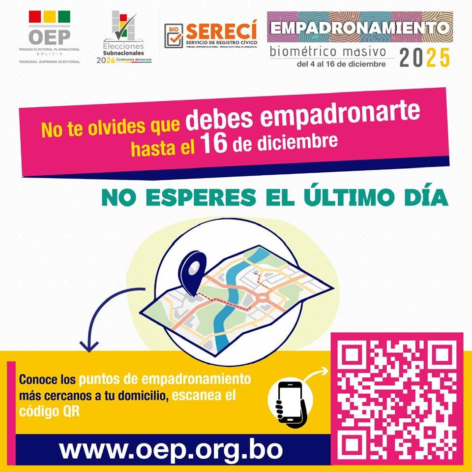 Mañana es el último día! Empadrónate. La democracia te convoca. Participa.Categorías NoticiasEtiquetas , Facebook, Pepe Pomacusi Periodista 14/12/2025 #EmpadronamientoBiométrico #EleccionesSubnacionales2026 Fuente: Pepe Pomacusi Periodista