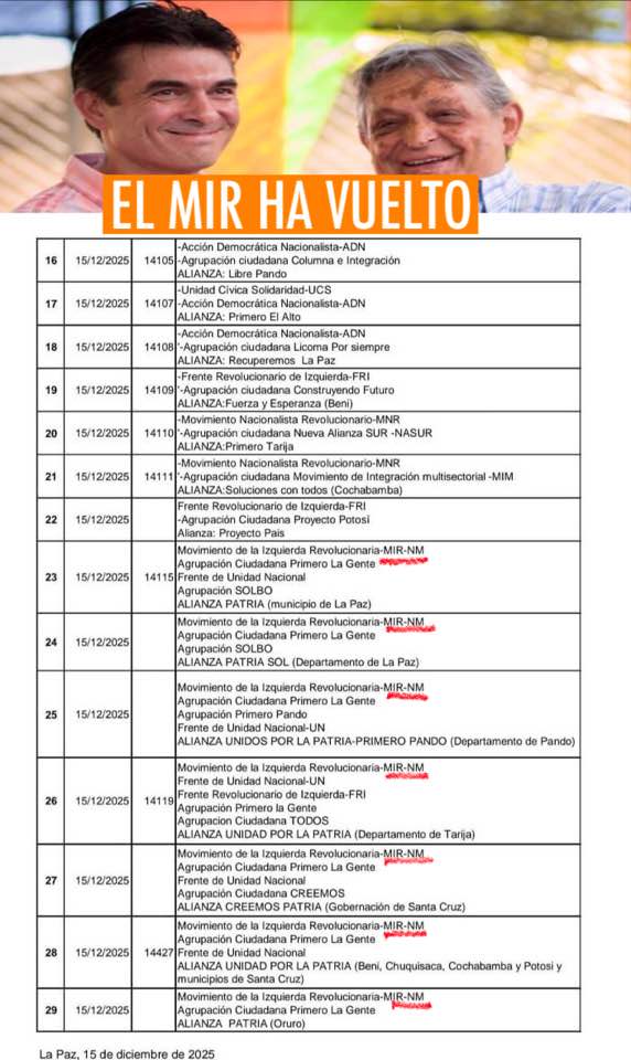 El MIR ha vuelto. En todo el país. Aparece en la inscripción de alianzas. Van el MIR, de Jaime Paz. Y Primero la Gente, de Rodrigo Paz. Con distintos aliados en todo el país.