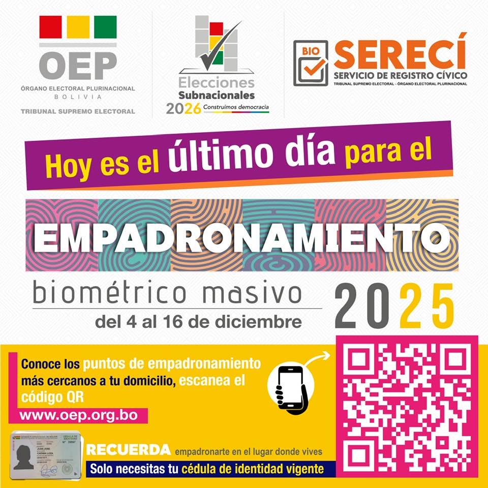 Último día. Empadrónate.Categorías NoticiasEtiquetas , Facebook, Pepe Pomacusi Periodista 16/12/2025 #EmpadronamientoBiométrico #EleccionesSubnacionales2026 Fuente: Pepe Pomacusi Periodista