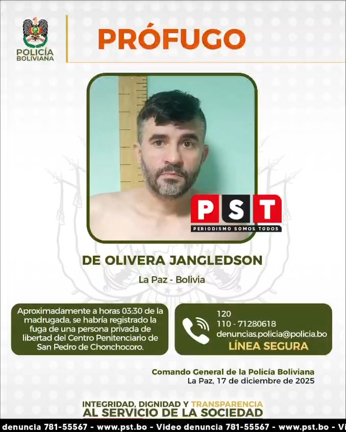 La Policía Boliviana reportó la fuga de dos peligrosos delincuentes de nacionalidad brasileña del Centro Penitenciario de máxima seguridad San Pedro de Chonchocoro, en el departamento de La Paz. Según el informe, los reclusos habrían utilizado una escalera para escapar del recinto, considerado uno de los más seguros del país.