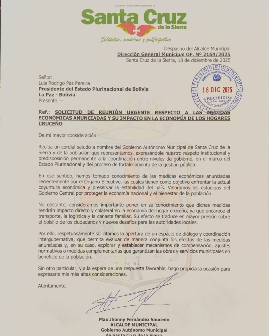 El alcalde de Santa Cruz de la Sierra, Jhonny Fernández, envió una carta al presidente del Estado, Rodrigo Paz, solicitando una reunión urgente para analizar el impacto de las medidas económicas anunciadas la noche de este miércoles, al advertir que estas podrían encarecer el transporte, la logística y la canasta familiar, afectando directamente la economía de los hogares cruceños y la prestación de servicios municipales, por lo que pidió abrir un espacio de diálogo intergubernativo que permita evaluar mecanismos de compensación y ajustes en beneficio de la población.