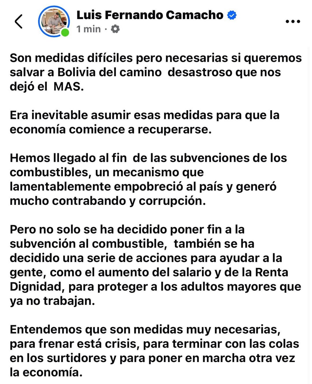 El gobernador de Santa Cruz, Luis Fernando Camacho, afirmó que la decisión asumida por el presidente Rodrigo Paz de poner fin a la subvención a los combustibles es una medida difícil pero necesaria para revertir la crisis económica que, según dijo, dejó el MAS, señalando que este mecanismo empobreció al país y fomentó el contrabando y la corrupción; sostuvo que la determinación va acompañada de acciones para proteger a la población, como el incremento del salario y de la Renta Dignidad para los adultos mayores, y aseguró que estas medidas permitirán frenar las filas en los surtidores y reactivar la economía nacional.