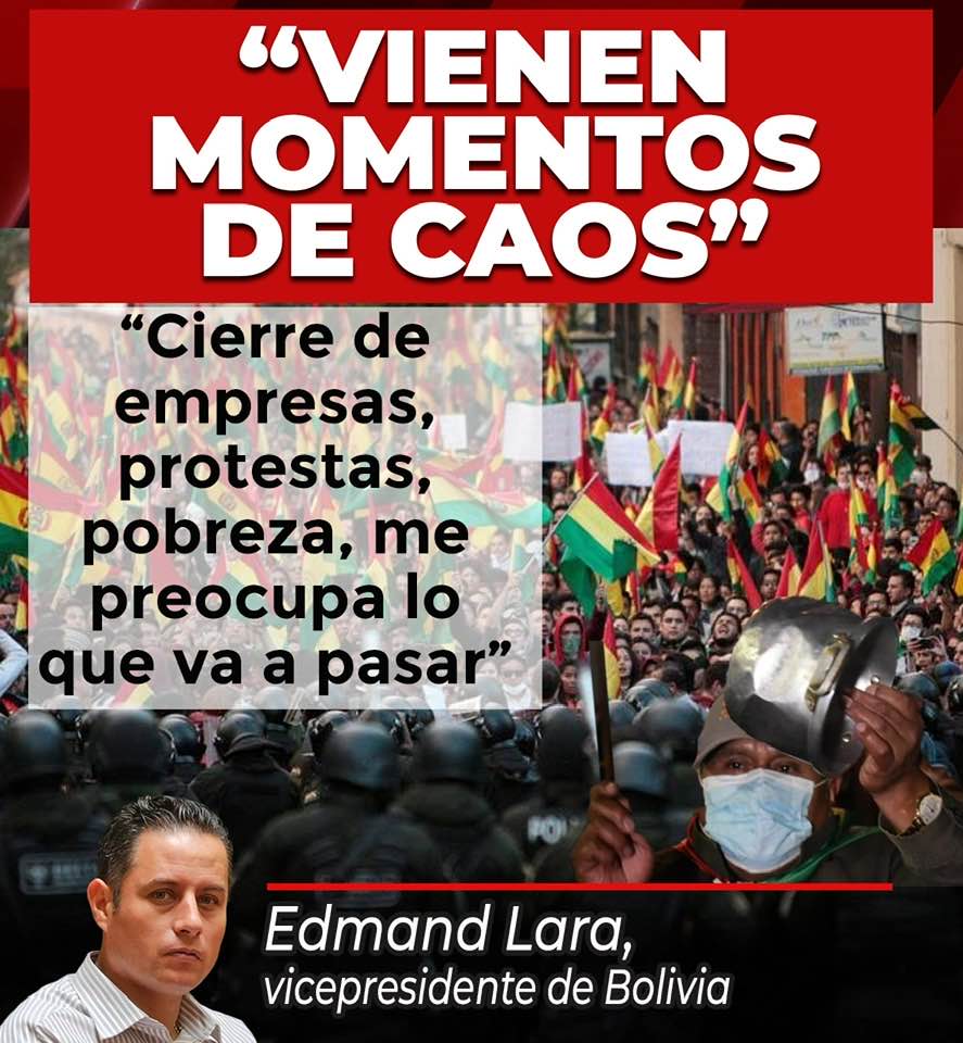 Para Lara, vienen momentos de caos. Reprueba las medidas del gobierno. No se considera parte del gobierno. Dice que no lo toman en cuenta. Y que le están dando el peor regalo de Navidad a los bolivianos.