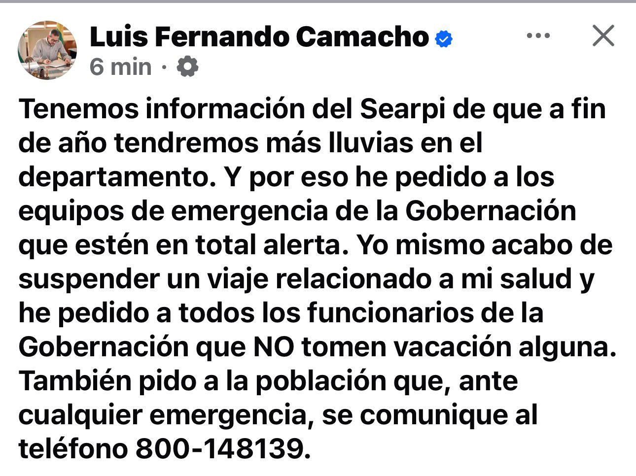 Camacho señaló que suspendió un viaje por motivos de salud y dispuso que ningún funcionario de la Gobernación tome vacaciones, con el fin de garantizar atención inmediata ante cualquier eventualidad.