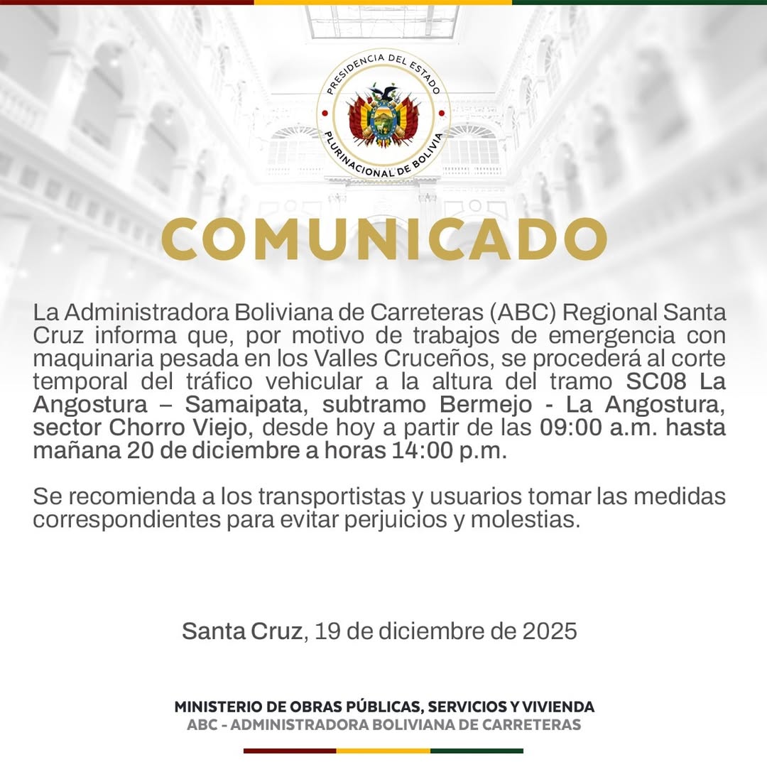 La Administradora Boliviana de Carreteras (ABC) Regional Santa Cruz informó que, debido a trabajos de emergencia con maquinaria pesada, la carretera que conecta Samaipata con La Angostura, en el sector Chorro Viejo, permanece cerrada desde las 09:00 de este viernes hasta mañana 20 de diciembre a las 14:00. La entidad recomienda a transportistas y usuarios planificar sus viajes y tomar rutas alternativas para evitar contratiempos y molestias durante el tiempo que dure el cierre.