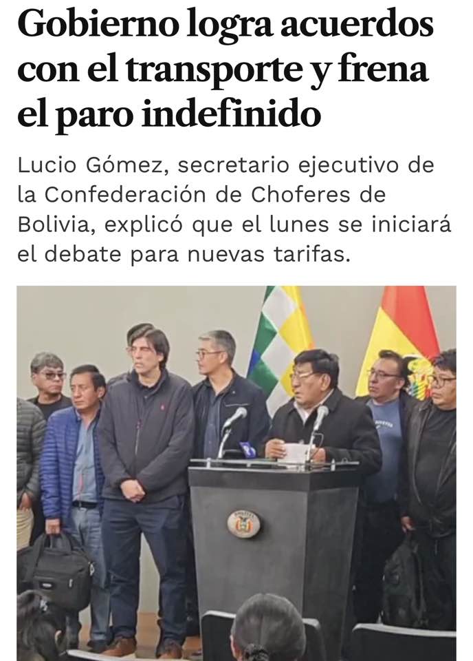No hay paro. Se firmó acuerdo con la Confederación de Choferes de Bolivia.Categorías NoticiasEtiquetas , Facebook, Pepe Pomacusi Periodista 22/12/2025 Fuente: Pepe Pomacusi Periodista