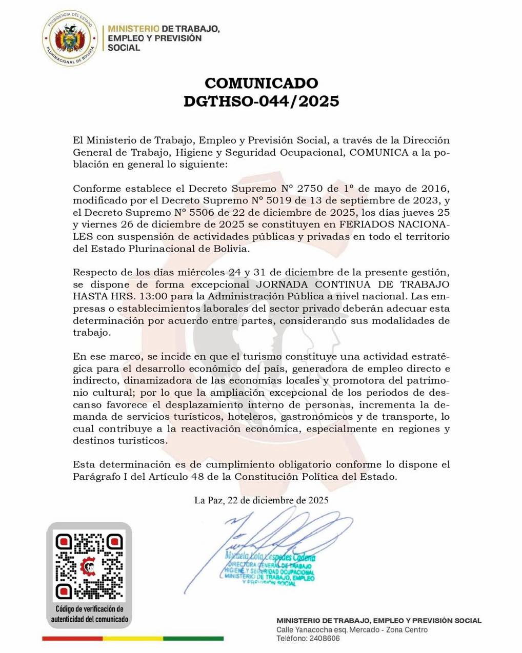 El Ministerio de Trabajo confirmó la noche de este lunes que este año habrá doble jornada de feriado nacional el jueves 25 y viernes 26 de diciembre. Además, informó que el miércoles 24 se aplicará jornada continua para el sector público. La medida busca facilitar las celebraciones de Navidad y permitir que las familias compartan más tiempo en estas fechas especiales.