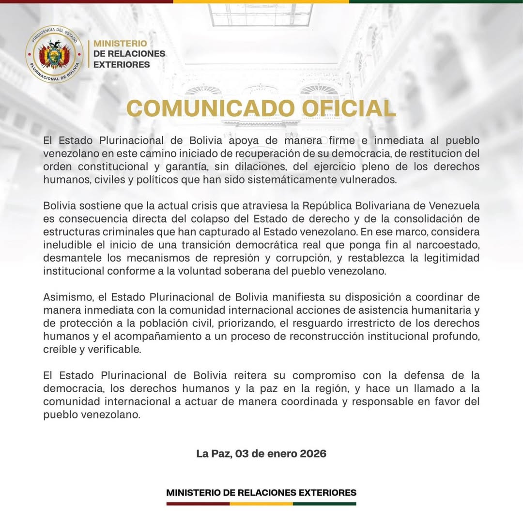 En el comunicado, las autoridades bolivianas señalan que siguen de cerca el desarrollo de los acontecimientos, llaman al respeto del derecho internacional y exhortan a que cualquier acción se enmarque en la legalidad, la paz regional y la protección de los derechos humanos.