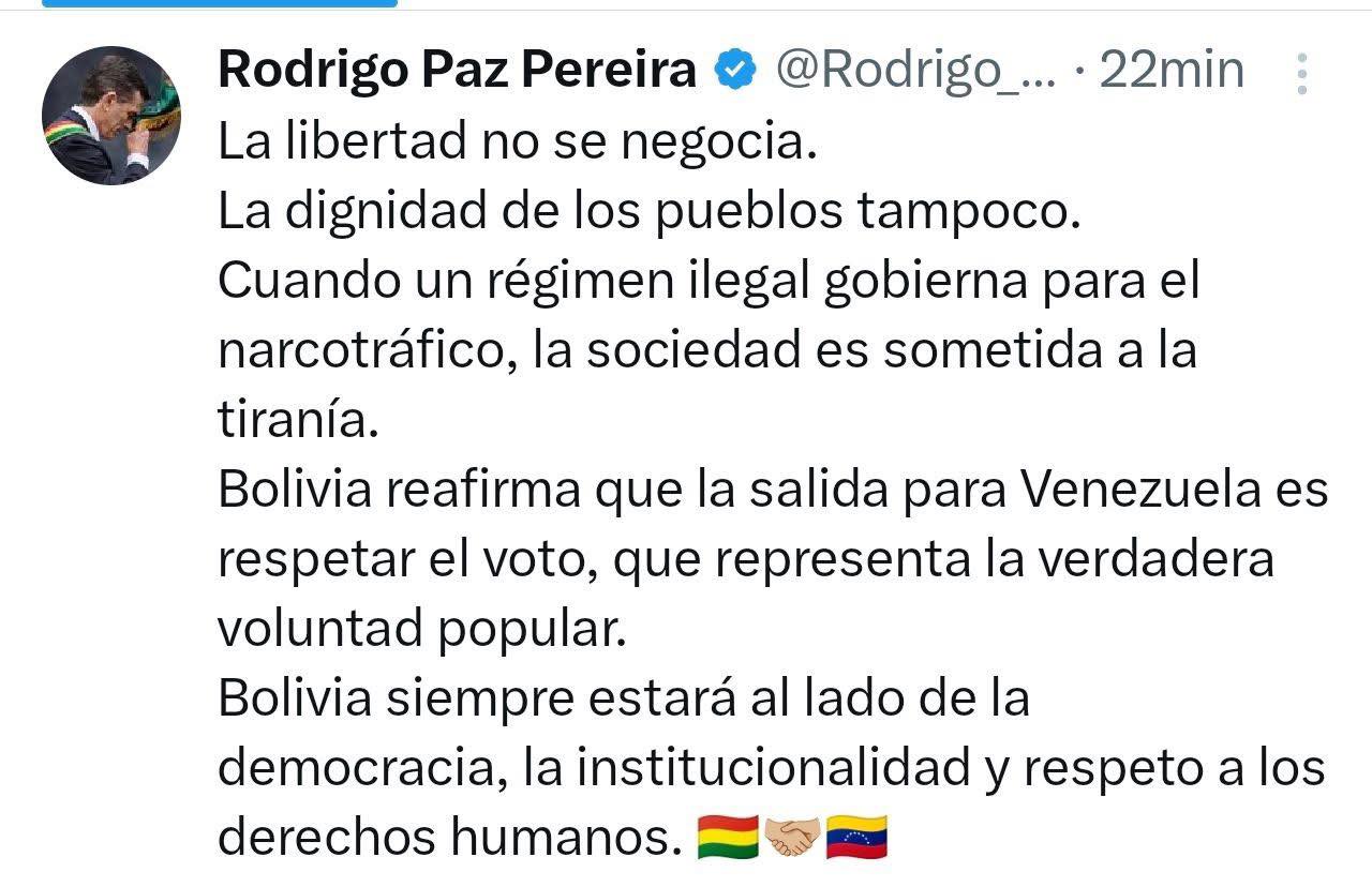 La publicación del Presidente Rodrigo Paz respecto a la captura de Nicolás Maduro.