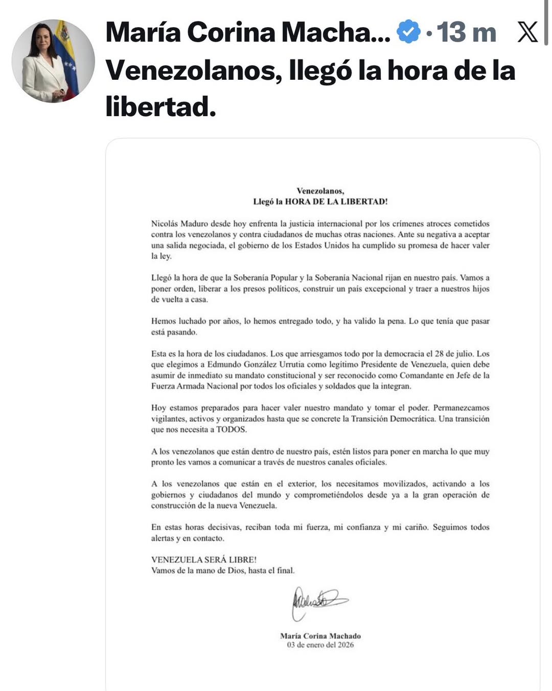 La líder opositora María Corina Machado afirmó que Nicolás Maduro enfrenta la justicia internacional y convocó a los venezolanos a mantenerse vigilantes y organizados para concretar la transición democrática. Señaló que Edmundo González Urrutia debe asumir de inmediato como presidente legítimo y llamó a la movilización dentro y fuera del país para reconstruir Venezuela.