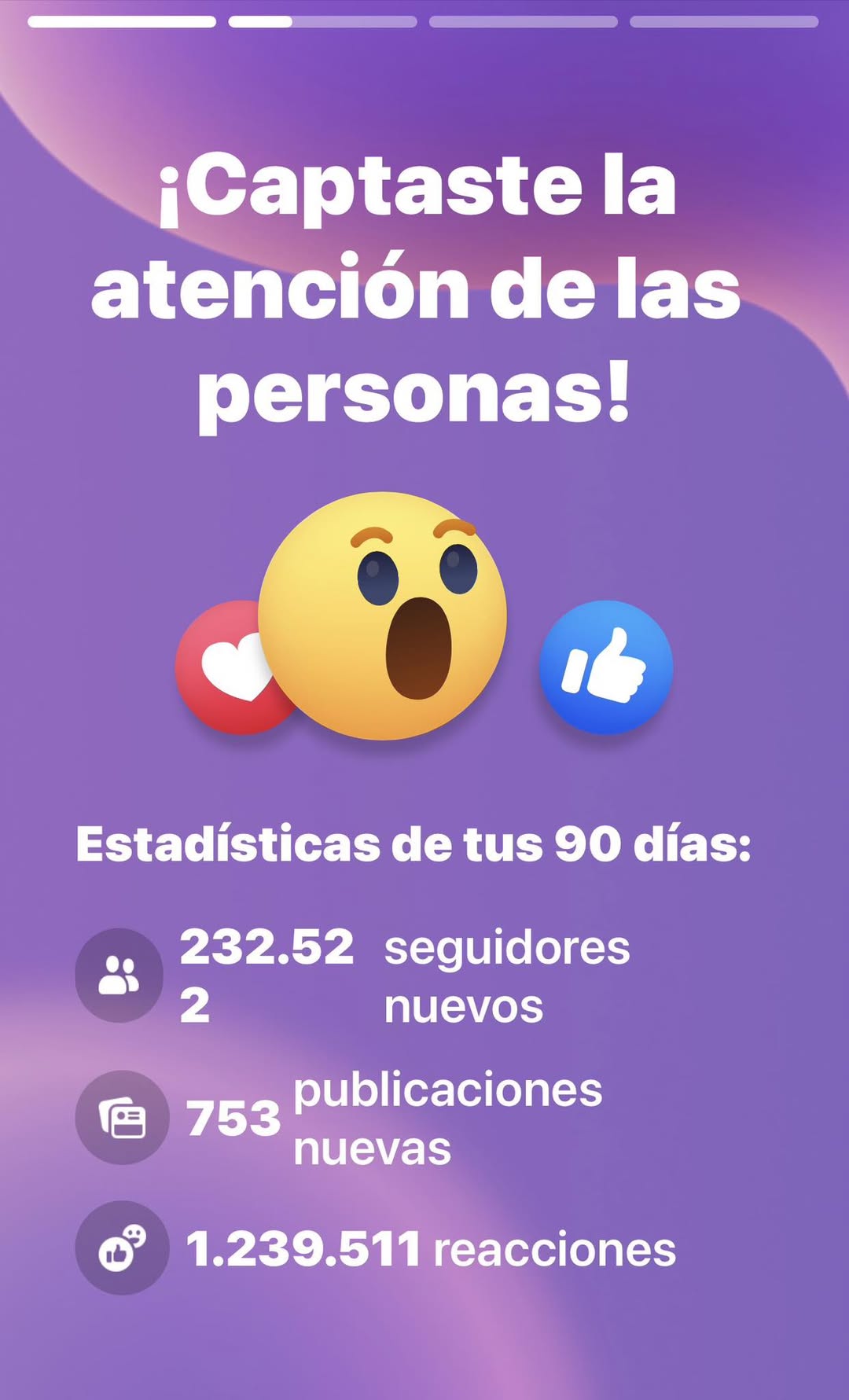 ¡Obtuviste 232.522 seguidores, creaste 753 publicaciones y recibiste 1.239.511 reacciones en los últimos 90 días! Gracias a todos por su apoyo constante. No podría haberlo logrado sin ustedes. 🙏🤗🎉