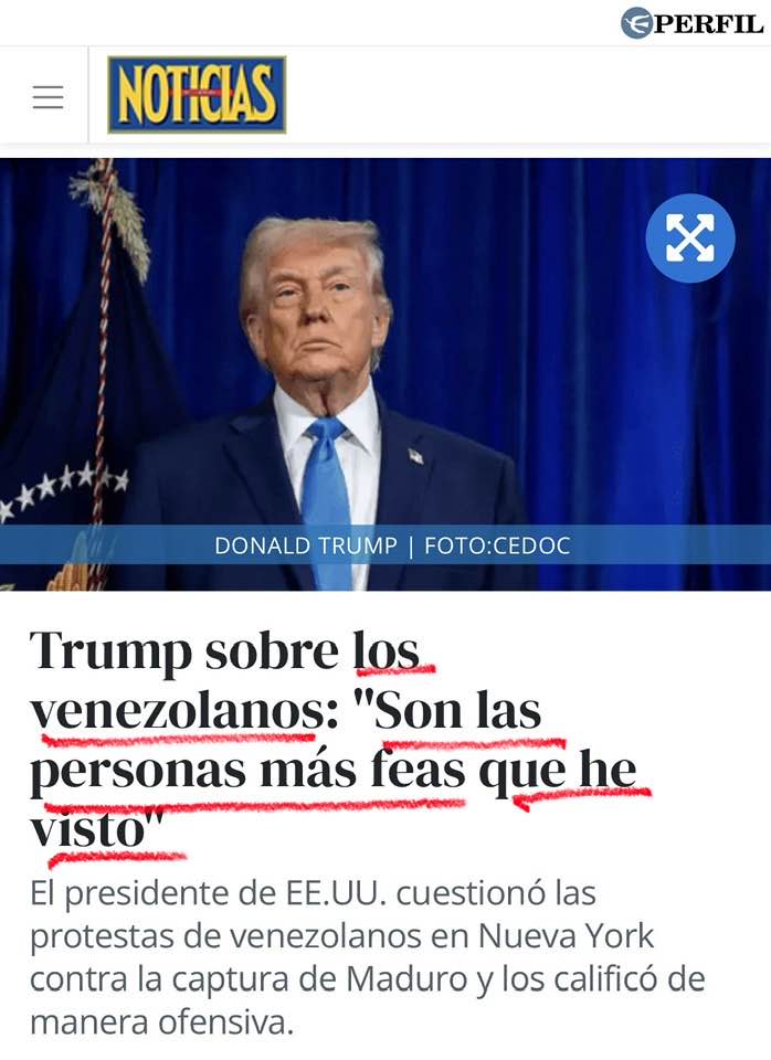 Trump les dice feos a los venezolanos. Violencia verbal. No solo helicópteros, Delta Force acribillando y drones disparando. La boca de Trump también es violenta. Descalificó una marcha de protesta de venezolanos en Nueva York. Por feos.