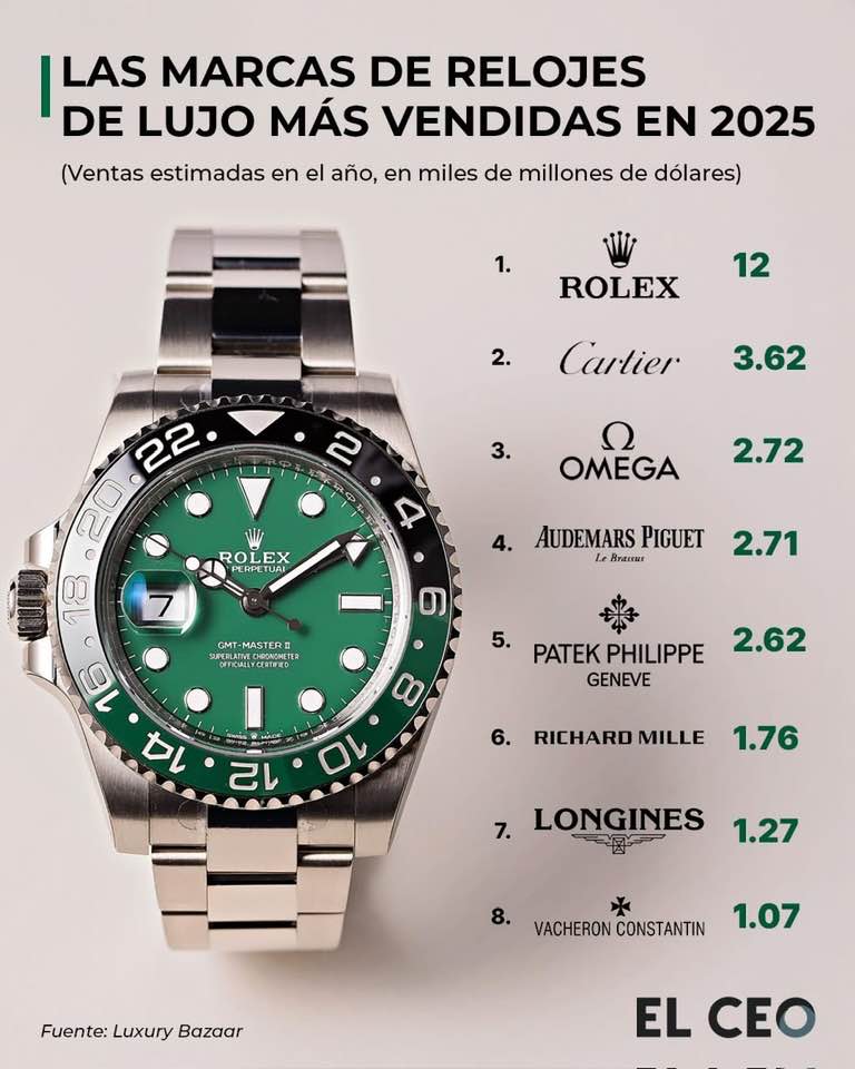 Rolex, Cartier, Omega. Y las menos conocidas, más caras y más distinguidas Audemars Piguet y Patek Philippe entre las más vendidas del mundo. Entre los relojes de lujo que deslumbran en el mundo.