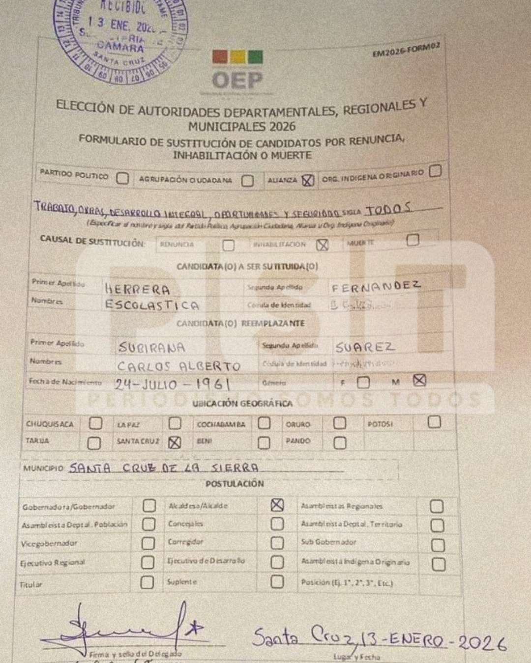 El Órgano Electoral Plurinacional (OEP) registró oficialmente este 13 de enero de 2026 la sustitución de candidatura de la alianza Todos para la Alcaldía de Santa Cruz de la Sierra, inscribiendo al Dr. Carlos Alberto Subirana Suárez como candidato reemplazante, luego de la inhabilitación de la postulante Escolástica Herrera Fernández, trámite que fue presentado ante la Cámara del Tribunal Electoral Departamental de Santa Cruz y formalizado mediante el formulario EM2026-FORM02, quedando el nuevo postulante habilitado dentro del proceso electoral municipal conforme a la normativa vigente.