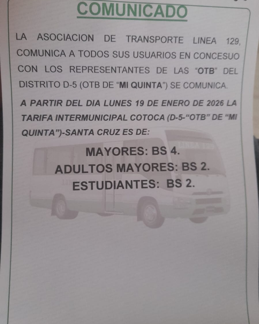 Vecinos del barrio Nueva Jerusalén, en la zona Mi Quinta, distrito 5, denunciaron un presunto abuso por parte de la línea de transporte urbano 129, única que ingresa al sector, tras el incremento del pasaje de Bs 2,50 a Bs 4, pese a que recientemente se definió que la tarifa urbana en Santa Cruz sea de Bs 3. Según relataron los afectados, una semana antes de la subvención el pasaje subió a Bs 3 y ahora fue elevado nuevamente a Bs 4 bajo el argumento de que la zona pertenece al municipio de Cotoca y no a la ciudad. Los vecinos cuestionan por qué no se estableció una tarifa diferenciada desde un inicio y aseguran que el aumento golpea duramente a familias de escasos recursos, ya que muchos usuarios deben tomar dos e incluso hasta tres líneas para llegar a sus destinos, debido a que la 129 solo ingresa hasta cierto punto del barrio y su parada final es el mercado Mutualista. Además, denunciaron que los transportistas habrían advertido con dejar de prestar el servicio si no se acepta el nuevo monto, situación que genera indignación y malestar en la población, que ahora pide la intervención urgente de las autoridades municipales para regular la tarifa y garantizar un servicio justo para los vecinos del sector.
