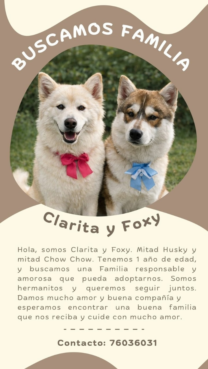 Clarita y Foxy, dos perritos de un año de edad, cruce de Husky y Chow Chow, buscan con urgencia una familia responsable y amorosa que les brinde un hogar definitivo, luego de que su dueño enfermara gravemente y ya no pudiera continuar cuidándolos; son hermanitos inseparables, cariñosos y de buena compañía, y la condición principal es que sean adoptados juntos para preservar el vínculo que los une. Contacto: 76036031.