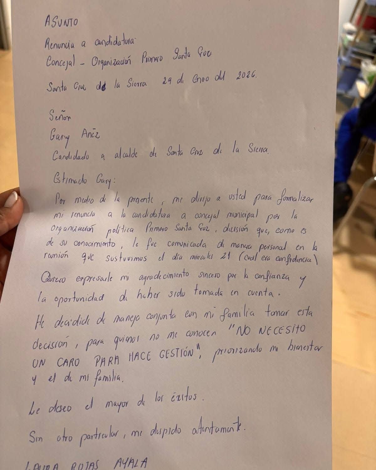 Laura Rojas, exdiputada, renunció oficialmente a su candidatura a concejal por la agrupación Primera Santa Cruz. La decisión fue anunciada a través de una carta escrita a mano que ella misma compartió en sus redes sociales, donde señala motivos personales y políticos para retirarse de la contienda. La renuncia fue confirmada en sus redes sociales.