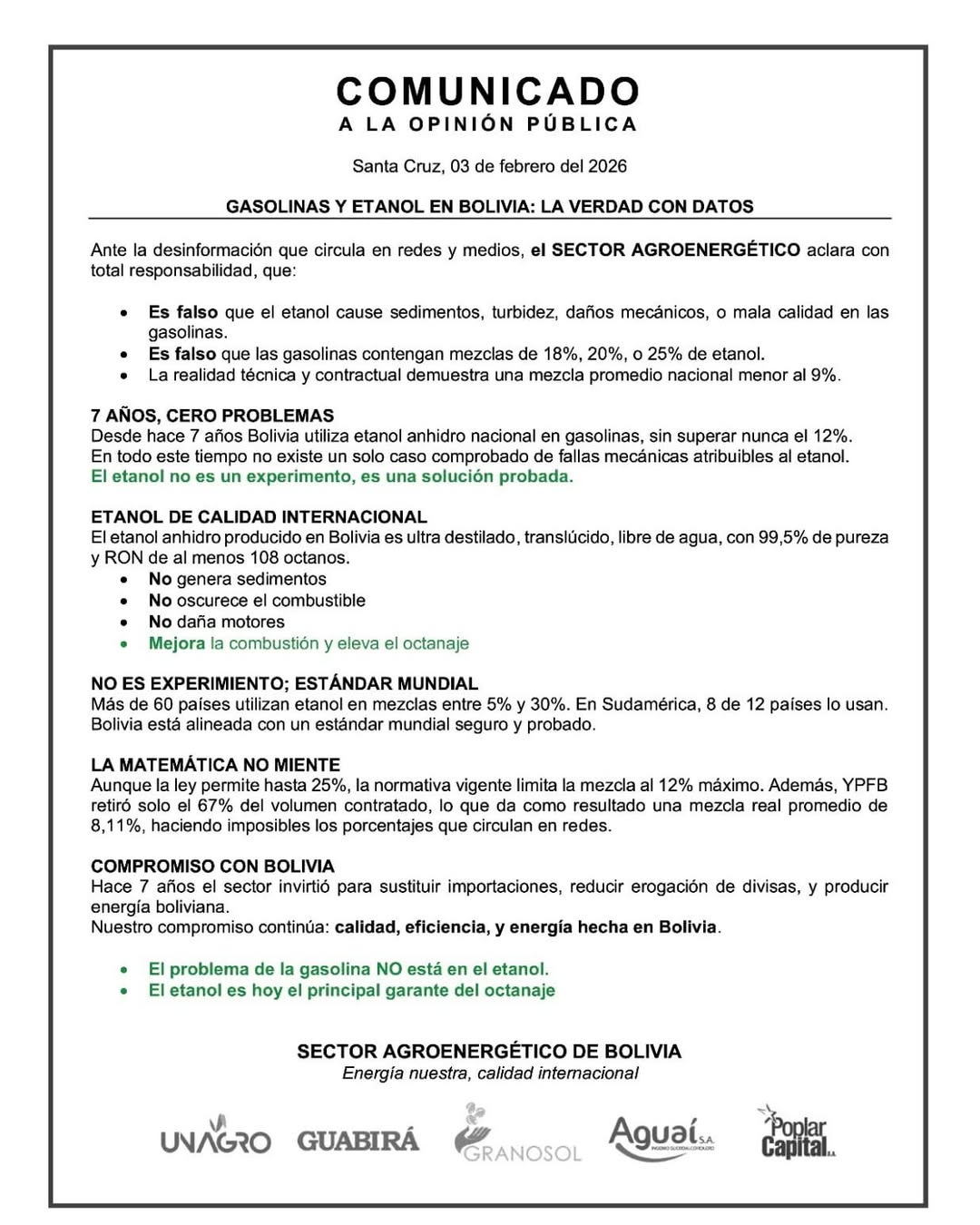 El sector agroenergético rechazó las versiones que atribuyen daños mecánicos al uso de etanol como aditivo en los combustibles y aseguró que, tras siete años de aplicación en el país, no existe un solo caso comprobado de fallas en motores que pueda ser vinculado directamente a este biocombustible, sosteniendo que su uso es seguro, cumple normas técnicas y contribuye a la reducción de la dependencia de combustibles fósiles.