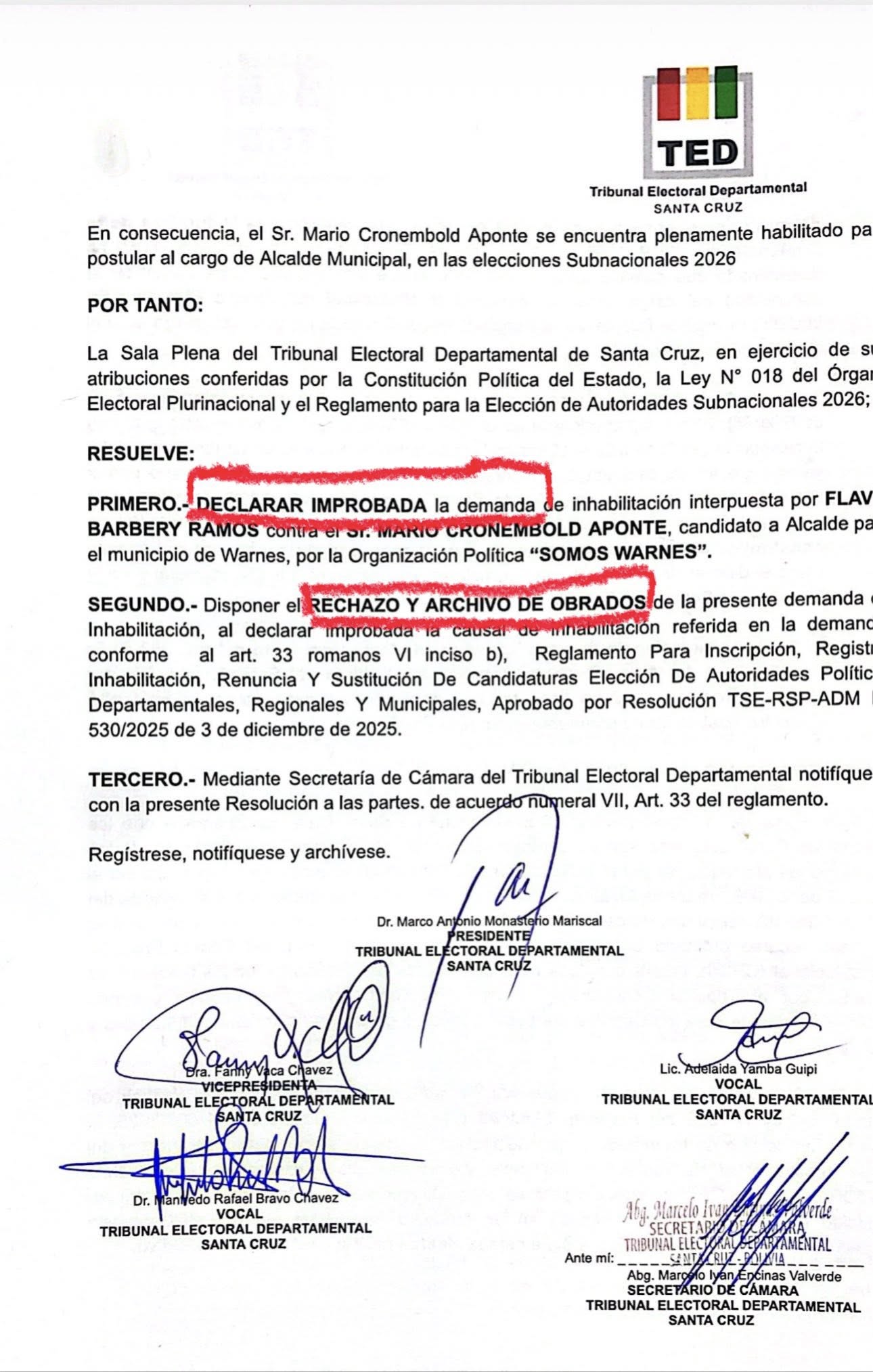 Se acaba de pronunciar la sala plena del Tribunal Departamental Electoral de Santa Cruz.
