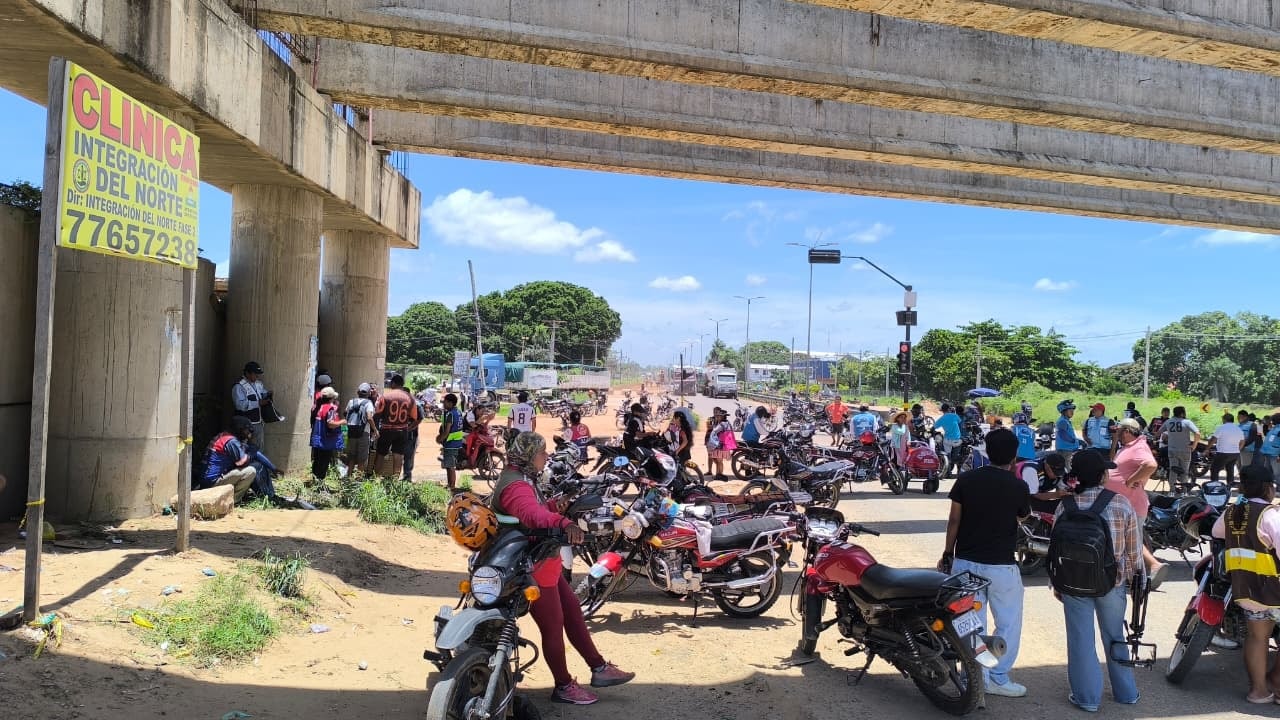 Mototaxistas mantienen un punto de bloqueo en la zona de Integración del Norte, frente a Satélite Norte, sobre la carretera Warnes–Santa Cruz, a la altura de la empresa PIL, como parte de sus medidas de protesta. Desde el sector no descartan que asociaciones de mototaxistas de Integración puedan sumarse en las próximas horas, mientras que el bloqueo que se registraba en Satélite Norte fue levantado tras una decisión interna, al no pertenecer a la Federación de Mototaxis del Norte Integrado, estableciendo un cuarto intermedio hasta el lunes.
