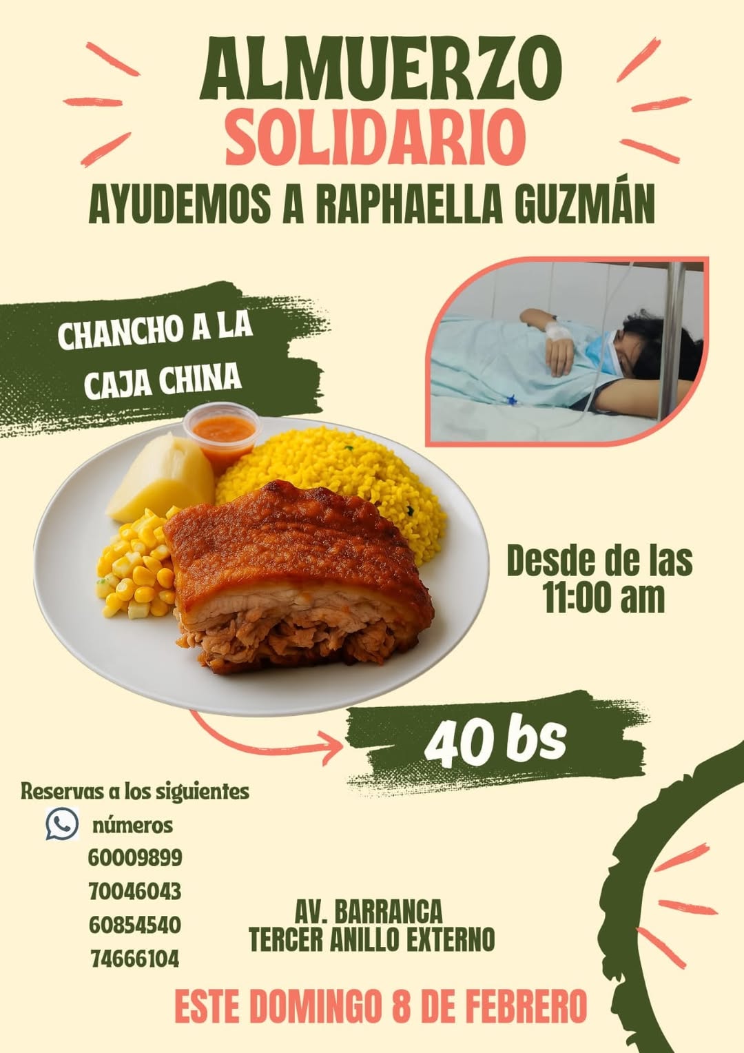 Familiares y personas solidarias realizan un almuerzo benéfico este domingo 8 de febrero con el propósito de recaudar fondos para cubrir los gastos médicos de Raphaella Guzmán, una niña de 10 años que atraviesa un delicado cuadro de dengue hemorrágico. La actividad se desarrollará desde las 11:00 de la mañana en la avenida Barranca, tercer anillo externo, donde se ofrecerá chancho a la caja china por un costo de 40 bolivianos. Quienes deseen colaborar pueden hacer sus reservas a los números 60009899, 70046043, 60854540 y 74666104. La iniciativa busca unir a la comunidad en apoyo a la menor y su familia en este difícil momento.