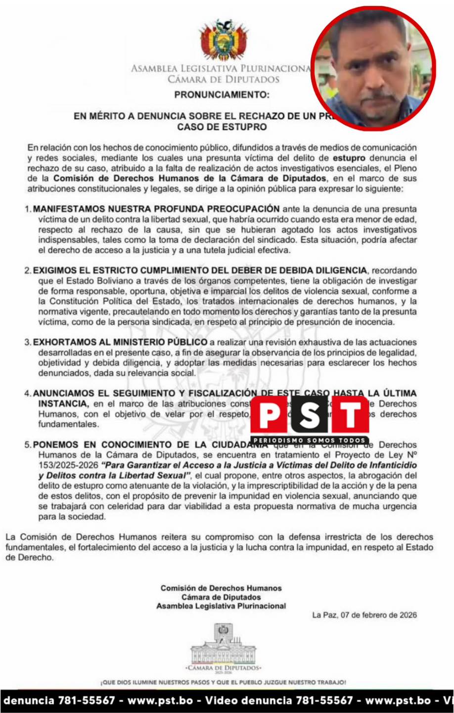 En su pronunciamiento, la comisión observa el cierre del caso dispuesto por la fiscal Margoth Vargas, quien estaba a cargo de la investigación, y anuncia que realizará seguimiento al proceso. Asimismo, exhorta al Ministerio Público a garantizar una investigación imparcial, objetiva y transparente, recordando que es una de sus atribuciones y obligaciones investigar cualquier denuncia, con mayor énfasis cuando se trata de hechos relacionados con violencia sexual.