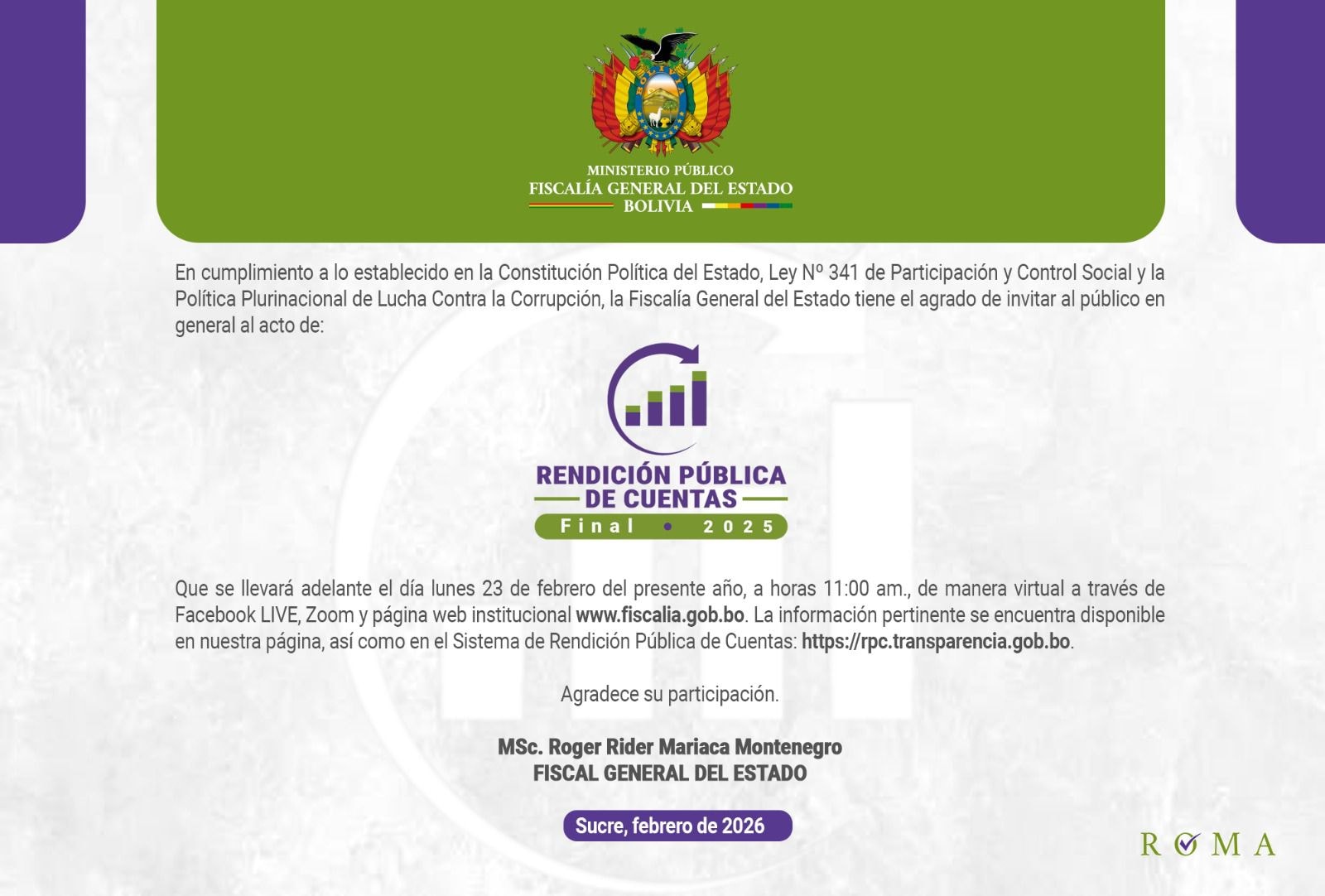 La Fiscalía General del Estado anunció la realización de su Rendición Pública de Cuentas Final 2025, que se llevará a cabo este lunes 23 de febrero a las 11:00 de la mañana, en cumplimiento de la Constitución y las normas de transparencia y lucha contra la corrupción, evento que será transmitido de forma virtual a través de Facebook Live, Zoom y su página web institucional, donde el fiscal general Roger Mariaca presentará los informes de gestión e invitará a la ciudadanía a participar activamente en este ejercicio de control social.