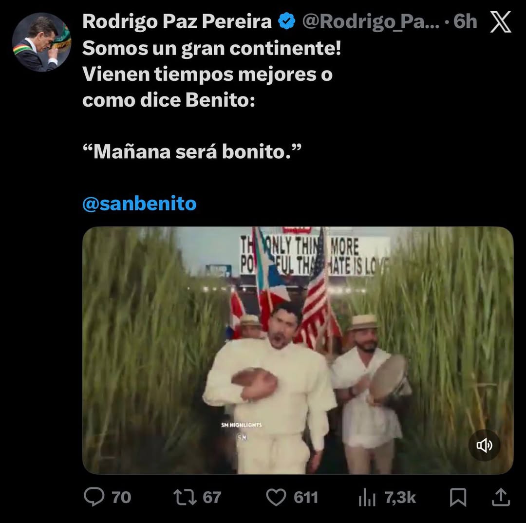 El presidente Rodrigo Paz publicó en sus redes sociales un mensaje celebrando la participación de Bad Bunny y la mención a Bolivia durante el espectáculo del Super Bowl 2026. En su post, Paz destacó que “somos un gran continente” y citó una frase inspiradora del artista: “Mañana será bonito”, resaltando el espíritu de unidad, identidad y riqueza cultural latinoamericana exhibido en el medio tiempo del evento global.