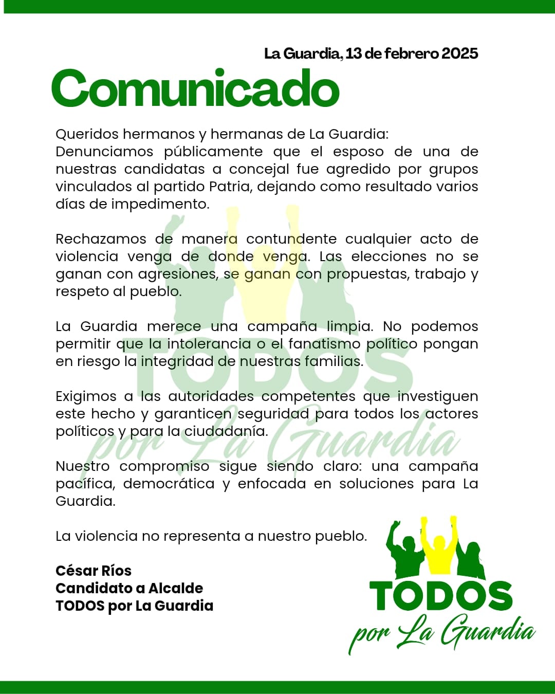 “La Guardia merece una campaña limpia”, señala el comunicado, en el que además reiteran su compromiso con una contienda pacífica y democrática.